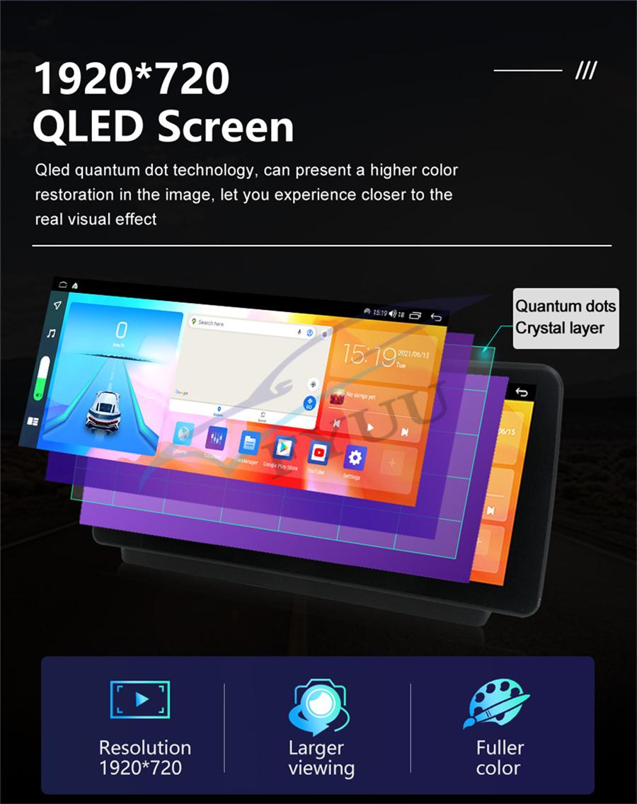 Display | - Touch Screen: Yes - Resolution: QLED 1920*720 - Main Menu Status Bar display: Can be changed to Music/Radio/BT-Stereo Player and Clock/Date/Week - Change Apps-Icon Position: Yes - Picture in picture / split screen:Yes Split screen feature enables you to use two applications at the same time. For example running Navigation with Music Player or Radio with Navigation at the same time. Optimum convenience for both the driver and passengers. |