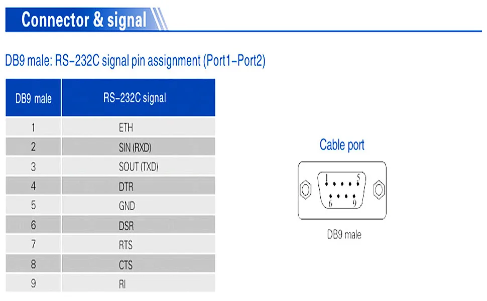 ● Signal: RS-232: DCD, RXD, TXD, DTR, GND, DSR, RTS, CTS, RI