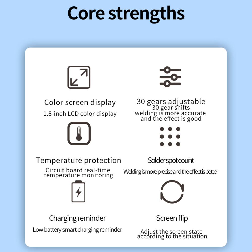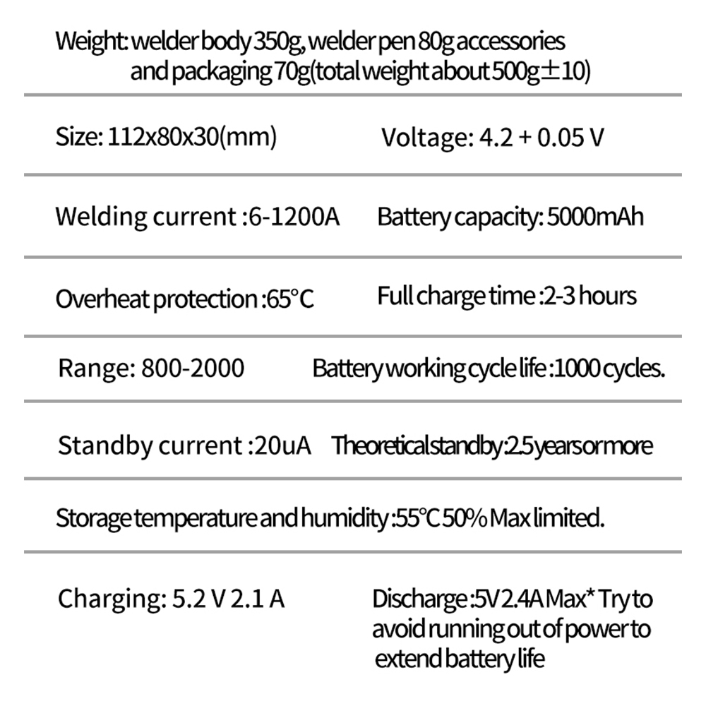 2.1A charging faster charging current increased to 2.1A, low power consumption standby one year low battery protection, no power automatic shutdown and other functions, temperature control protection, real-time circuit board temperature monitoring, welding point counting, welding more accurate effect.