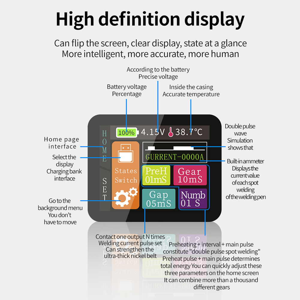 Simple operation, solid welding, complete welding joints, 1.8 inch LCD color display, 30 adjustable gears, gear switching welding more accurate, for different materials to find a more suitable gear output, better welding results.