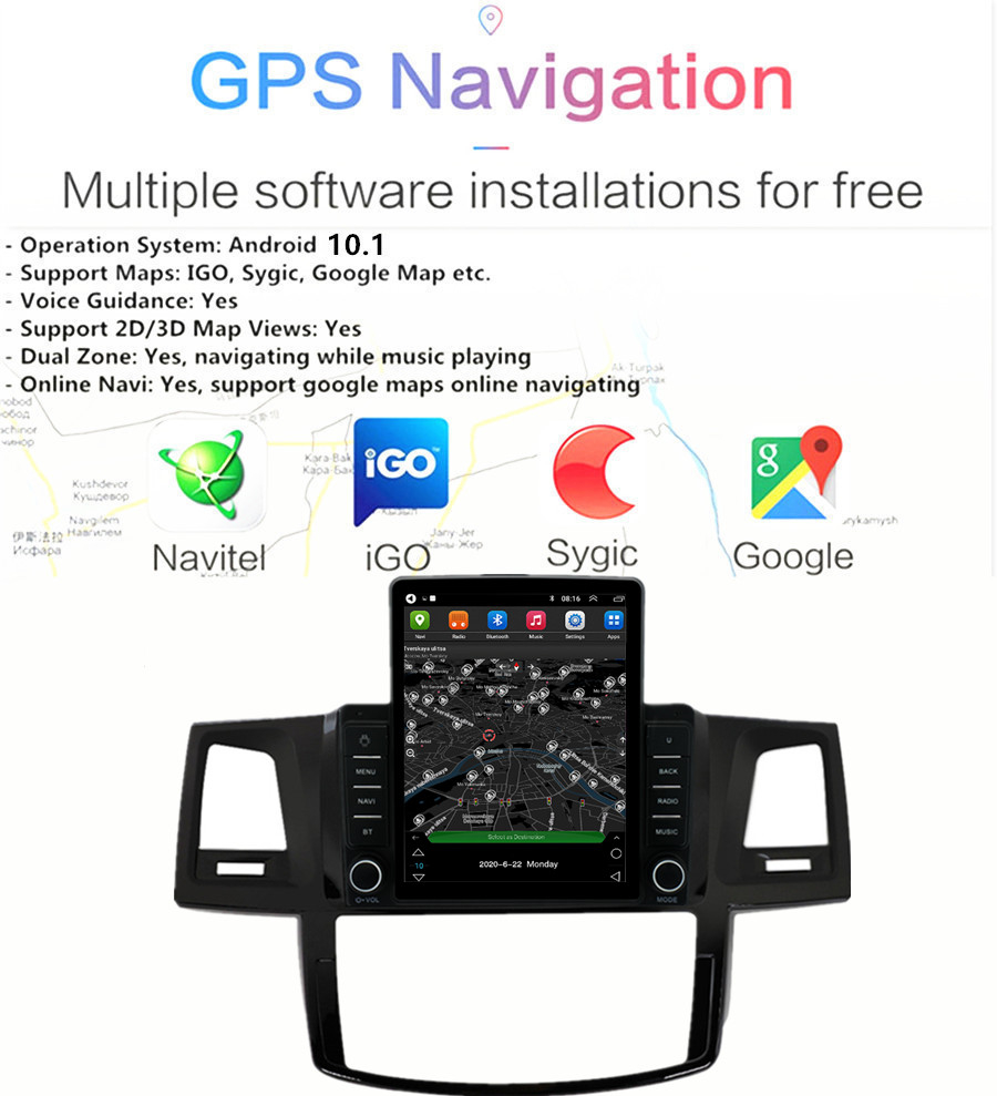 GPS | - Operation System: Android 10.1 - Support Maps: IGO, Sygic, Google Map etc. - Voice Guidance: Yes - Support 2D/3D Map Views: Yes - Dual Zone: Yes, navigating while music playing - Online Navi: Yes, support google maps online navigating |
