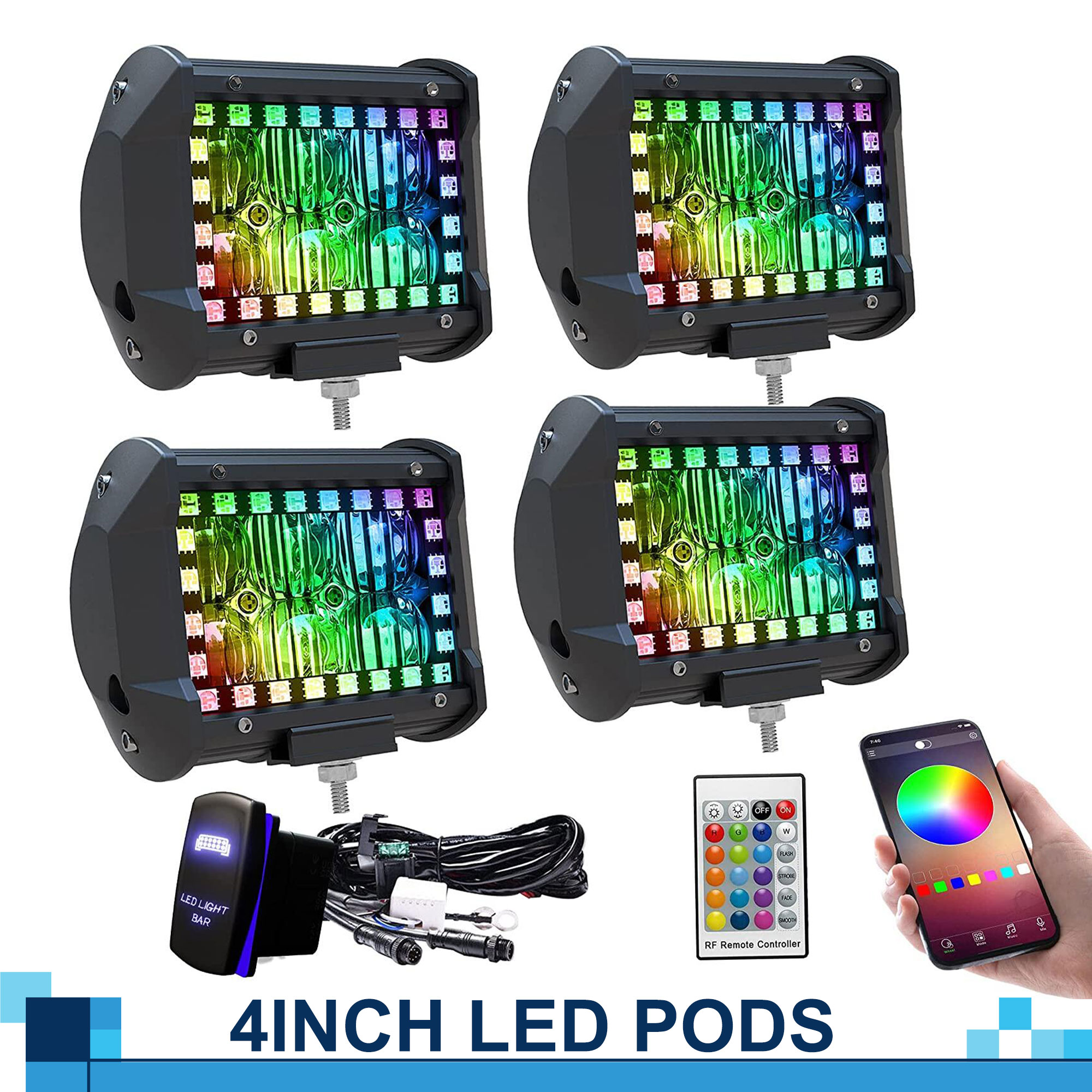 The RGB halo strip was installed inside the led light bar which was protected by the lens. It can light up a dark road, provide wider vision and customize your car. Both of illuminating led light and RGB color changing/chasing light can be controlled by one Bluetooth app.