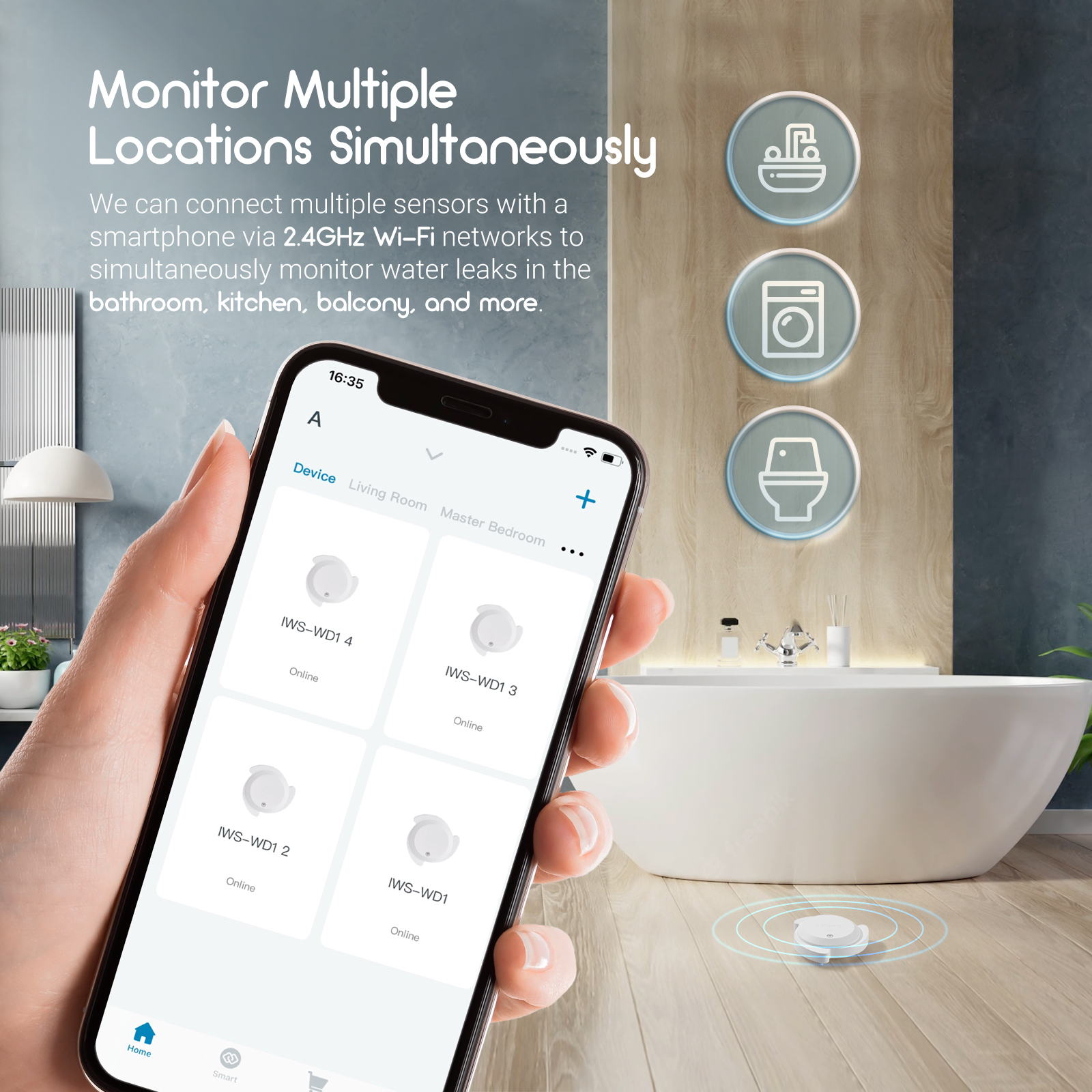 One smartphone can simultaneously connect multiple sensors so that we can monitor many locations of leaking and dripping at the same time and confirm the safety of our home anytime, anywhere.