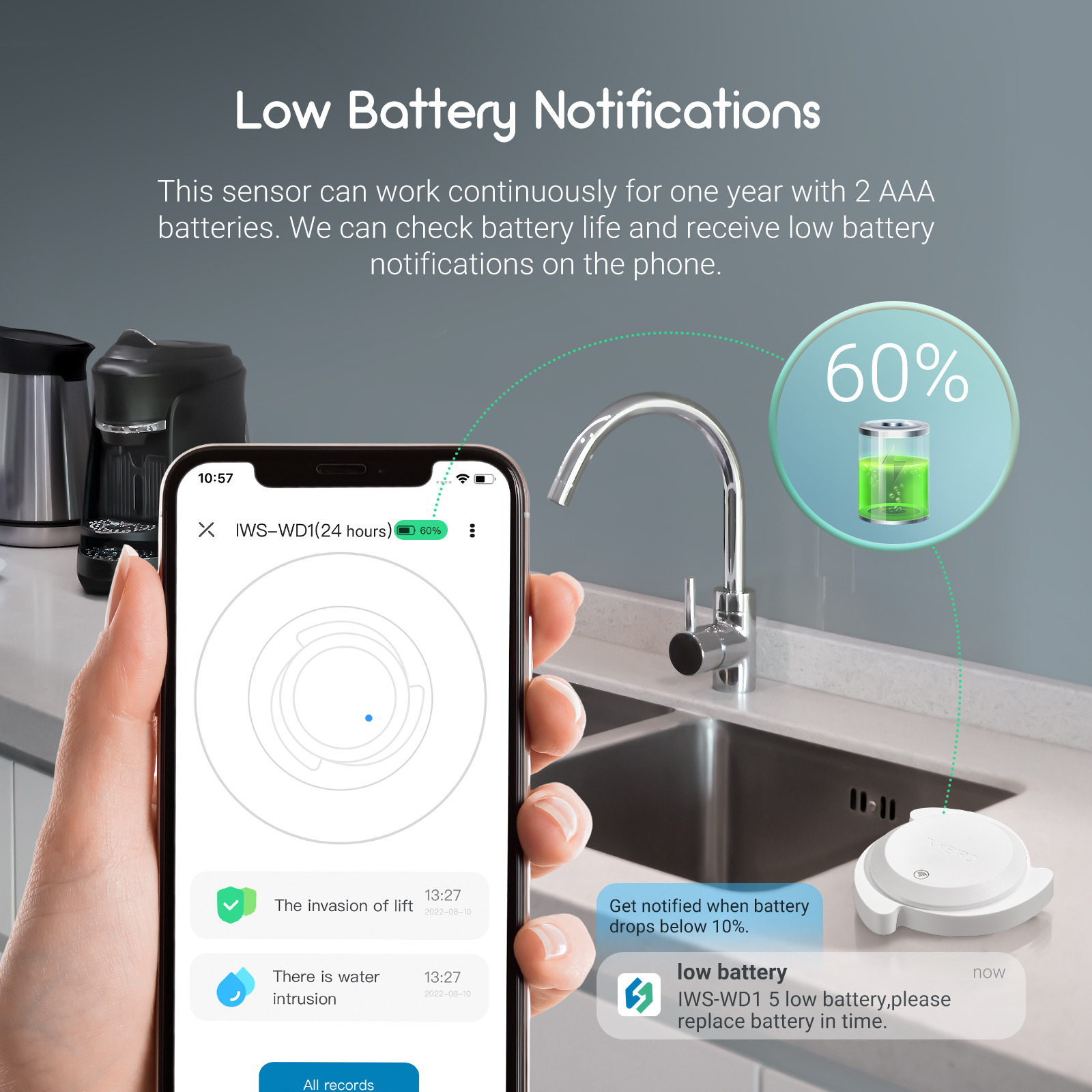 Whenever a water leak is detected, the sensor will sound an alarm six times and send an alarming notification through the smartphone to remind us to take preventive actions in time. We can also check all alarm records on the app. With its 24/7 monitoring, this sensor is reliable to help us guard our home from water leaking.