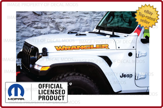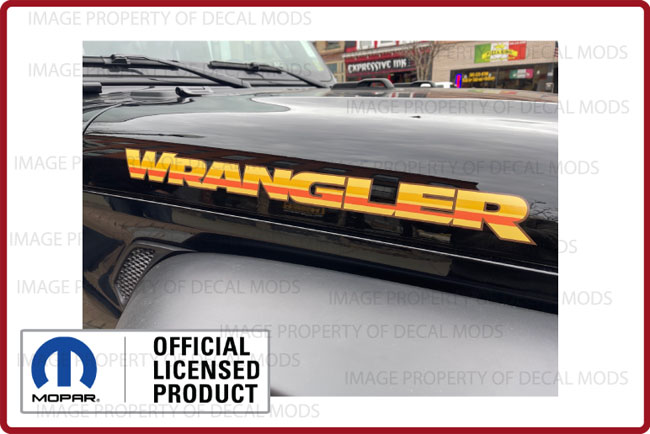 This set includes the following: - Set of 2 - WRANGLER hood decals (Part number: FJ9X4). - Decals are in the color: Retro Shades Yellow/Orange/Brown - Installation Instructions |