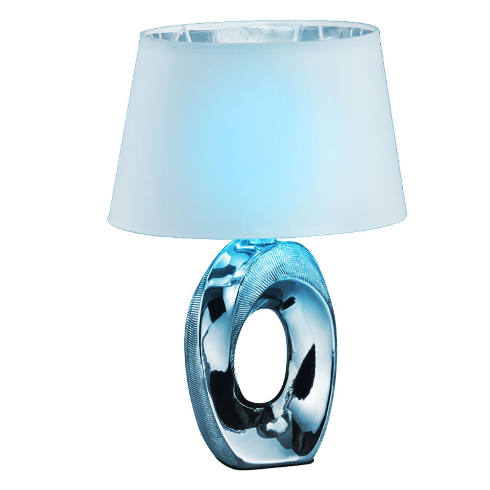 Ob als Nachtischleuchte im Schlafzimmer, auf der Kommode oder auf dem kleinen Beistelltisch im Wohnzimmer, die Leuchte mit einer Größe von 23×33 cm wird auch tagsüber zu einem echten Blickfang. Der silberfarbige Keramikfuß ergibt zusammen mit dem außen weiß und innen silberfarbigen Stoffschirm ein modernes und zugleich klassisches Gesamtbild ab, dass sich ideal in unterschiedliche Einrichtungsstile integrieren lässt.