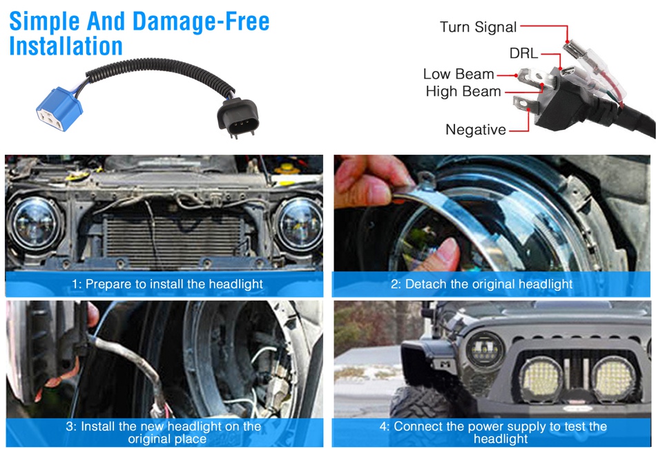 Pair 7" Round LED Headlights 3800LM Car Headlamp Fit for Honda Yamaha Motorcycle Product Detail Image GalleryProduct DescriptionOverview:Our 7In LED headlight provides a supper bright illumination with up to 3800lm brightness for high beam and 1800lm brightness for low beam. Designed with halo which can be used as DRL guide light with white light or as turn signal light with amber light to improve driving safety. Compatible with 12/24V vehicles such as motorcycle and Jeep Wrangler JK/ LJ/ CJ/ TJ and more. Included H4 to H13 adapter makes it simply plug and play for convenient use. Constructed with durable die-casting aluminum alloy, PC lens and 2 air holes at the back, it’s IP67 waterproof and has better heat dissipation, ensuring a long lifespan up to 30,000 hours. Features:- 4 Lighting Modes & 2 Colors:Designed with a cool halo ring which can be used as DRL guide light with bright white LEDs and turn signal light with bright amber LEDs to make your car attractive and meantime improve driving safety. High beam and low beam modes offer you different illuminating choice to meet your driving need.