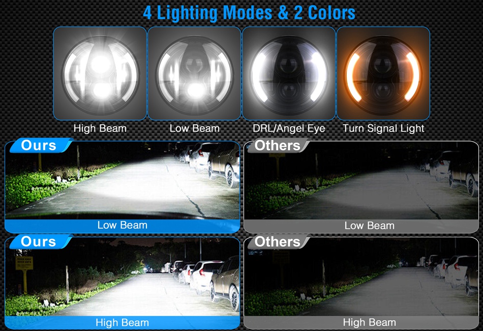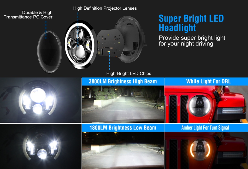 - Super Bright:Adopting high-grade LED chips for 7in 40W headlight,provides a supper bright driving illumination with up to 3800lm brightness for high beam and 1800lm brightness for low beam,giving you super bright light during driving at night.