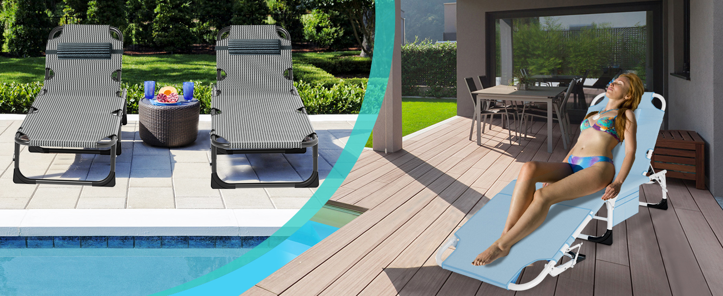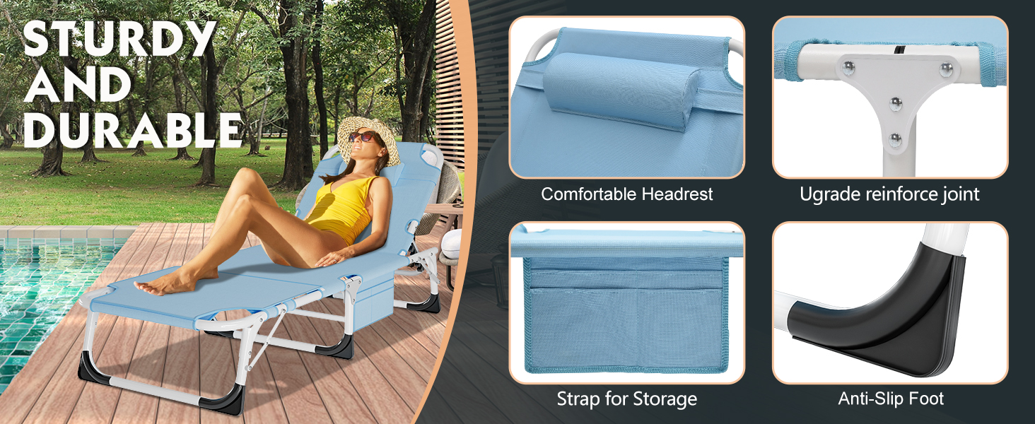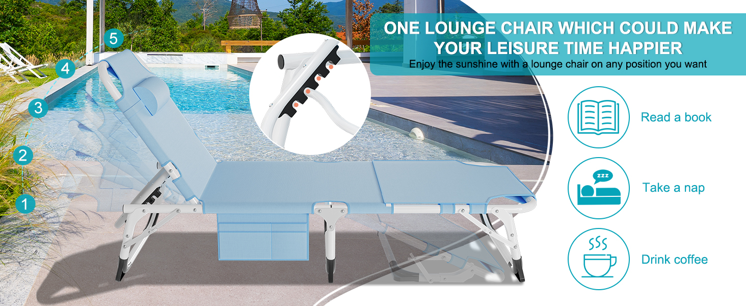 Tanning chair features a convertible open/close face-down hole, arm slots, removable Cushion and a pillow. A practical sunbathing lounge chair for outside, poolside, patio, lawn, garden, beach, and more. It can be used as a camping cot, lounge chair, or guest bed. Adjustable backrest with 5 level angle and 2-level footrest allow you to sit, recline and lie. Lightweight and portable, take your personal tanning bed / massage table / reading chair with you and succumb to the complete comfort experience. Characterized by folding and lightweight design, this patio chaise chair is perfect for outdoor use, which can be easily carried anywhere. Children, adults, and the elderly all could use it easily. Just unfold everything out, and enjoy yourself. With the built-in carrying handle and shoulder strap, the pool lounge chair is convenient for transportation. 5 POSITIONS ADJUSTABLE: The adjustable lounge chairs are designed with 5 positions adjustable locking system, which allows you to find the perfect angle for your back and legs. You can sit up, recline, or lay flat so you can enjoy sunbathing, tanning, reading, relaxing, or taking a nap.
