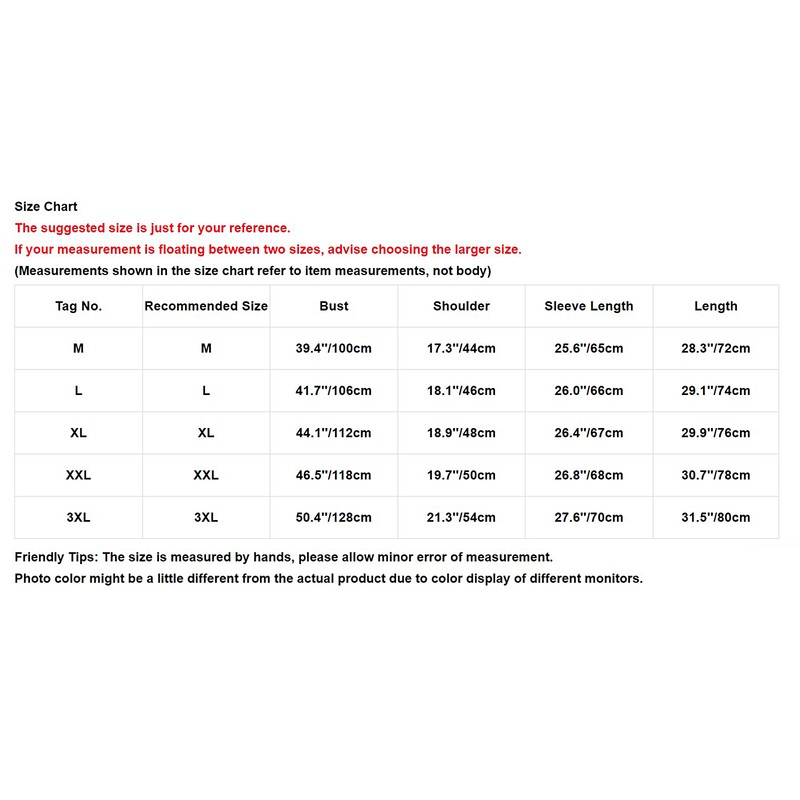 | Tag No. | Recommended Size | Bust | Shoulder | Sleeve Length | Length |