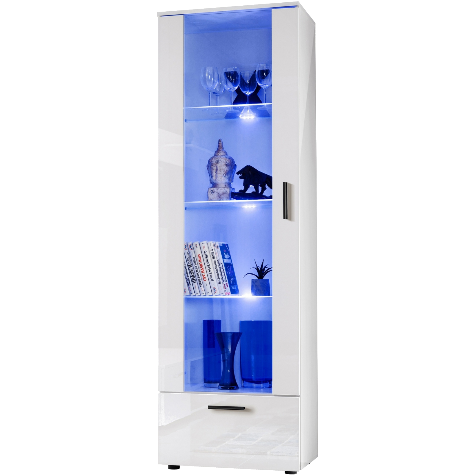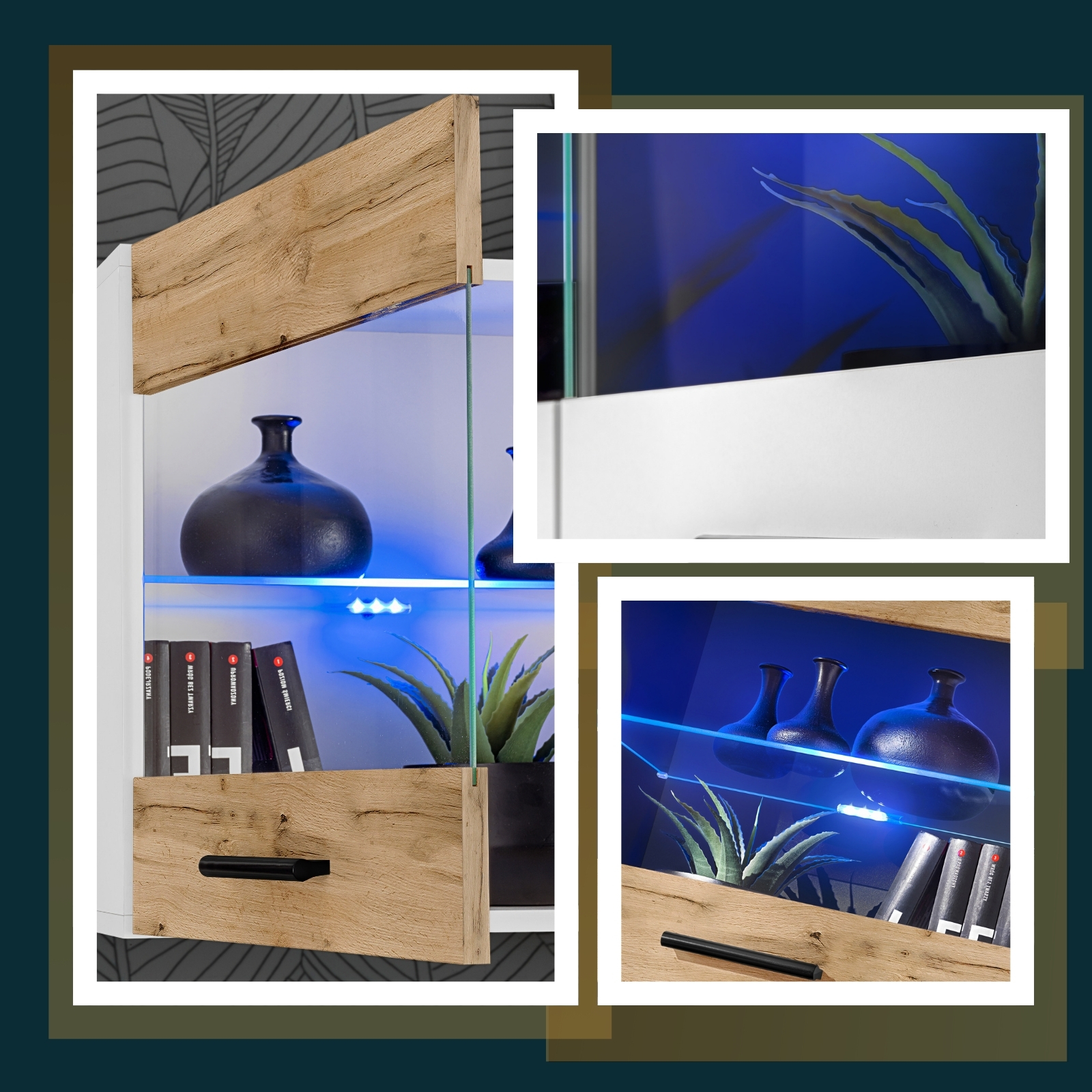 Mit der Vitrine Savona können Sie Ihre Küche, Ihr Wohnzimmer oder Ihr Schlafzimmer organisieren. Sie hat Platz für Porzellan, Gläser, Kaffeeservice oder Souvenirs. Ihre einfachen, geometrischen Formen machen sie zu einem zeitlosen Möbelstück, das zu einer Vielzahl von Einrichtungsstilen passt, insbesondere zu modernen und skandinavischen. Die Glasböden und -türen, zusammen mit der (optionalen) Beleuchtung, ziehen die Blicke auf sich und schaffen eine intime und erhabene Atmosphäre.
