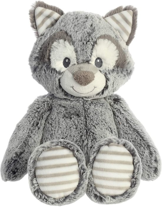 Ebba’s Rocko Raccoon 14" Cuddler plush toy stuffed animal (by Aurora World) NEW with tags. Features silky soft plush fabric in two-tone shades of cream and gray; striped contrast on the ears and feet; endearing, happy face with embroidered eyes and plush nose; striped tail; and floppy arms and legs. Soft to the touch, squeezable, cuddly, and adorable. Rocko is a great tag-along forest friend; he’s ready to go anywhere you want to go. Posture: lying or sitting. Polyester fabric. Machine washable.