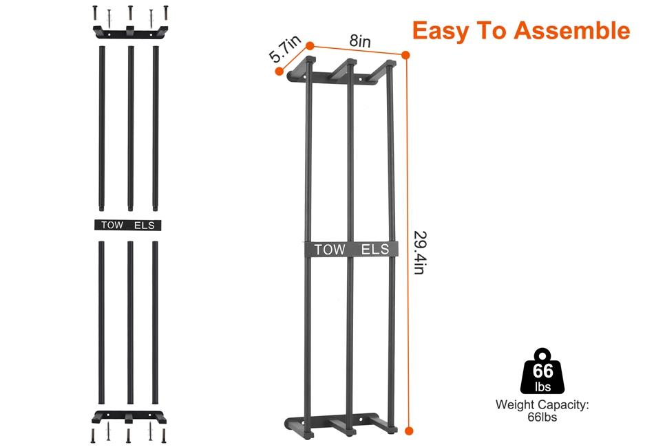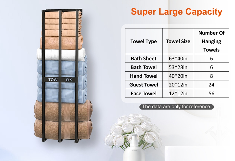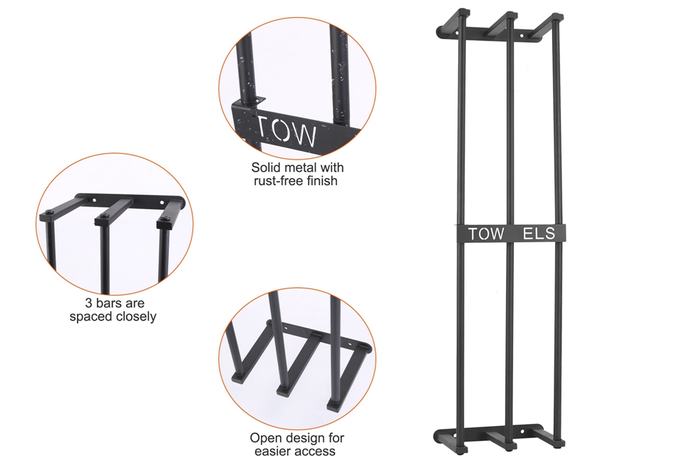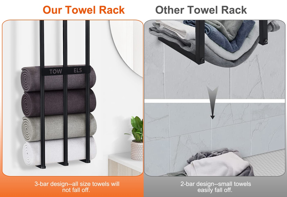- 3 Bar Towel Rack:It features 3 towel bars that are spaced closely together,which is able to accommodate all sorts of towels up to 6 large bath towels or 56 small hand towels. Small hand towels will not fall off and large towels stand stably due to the closer gaps and middle support bar.