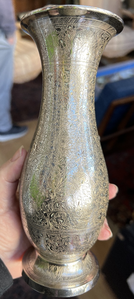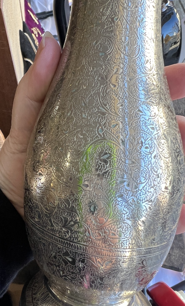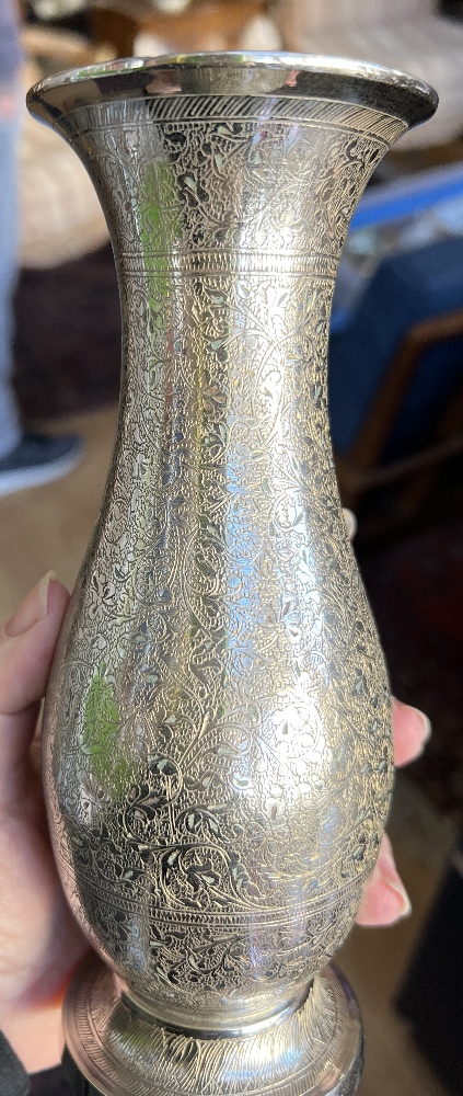Antique Middle Eastern Hand Chased Engraved Vase Pair Floral Silver Plate 8” H