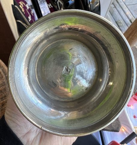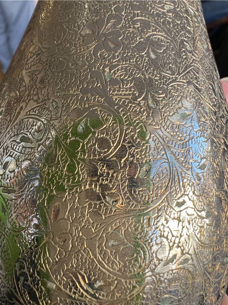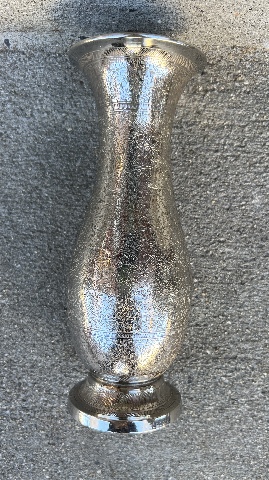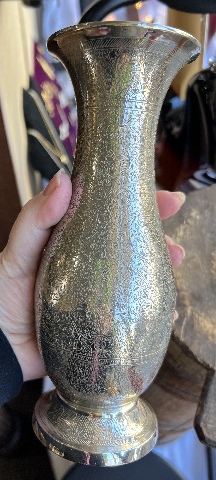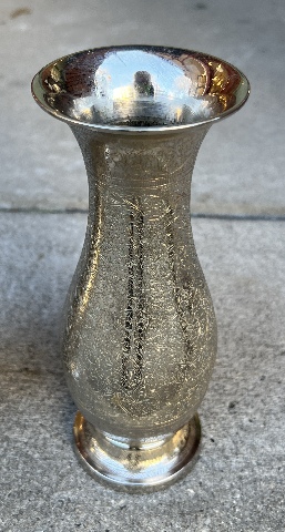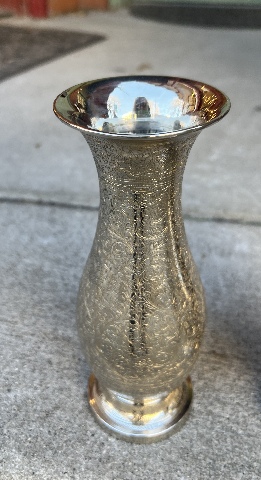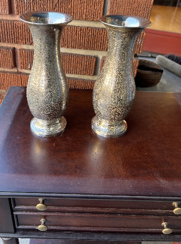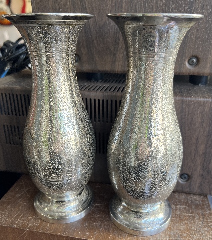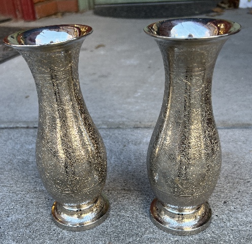 We are offering an antique pair of Middle Eastern silver plate engraved vases, each measuring about 8” tall and 2.75” in diameter at the base.