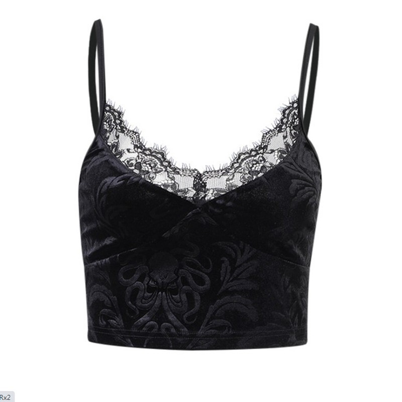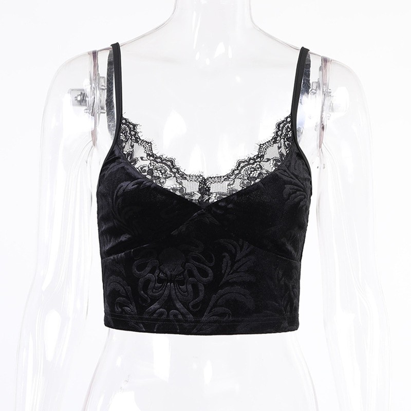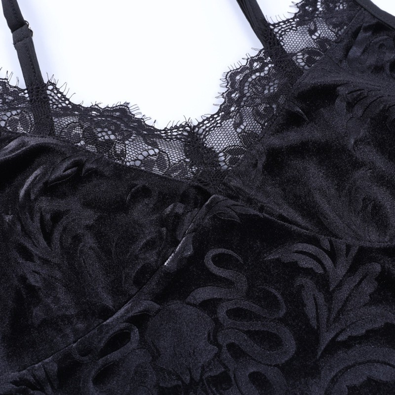 Women V Neck Low Cut Shoulder Straps Sleeveless Open Upper Back Lace Velvet Vest Crop Top.