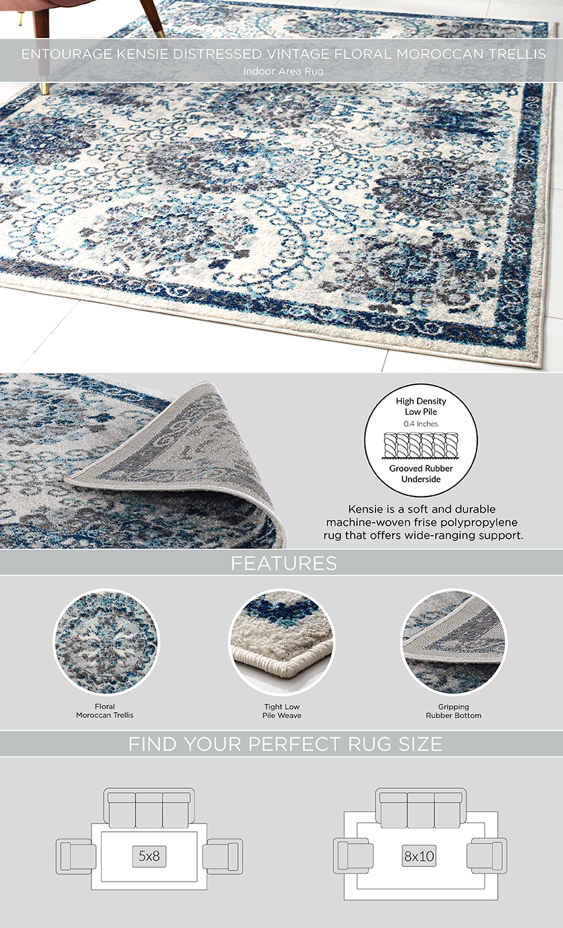 Make a sophisticated statement with the Kensie Distressed Vintage Floral Moroccan Trellis Area Rug from the Entourage Collection. Patterned with an elegant floral medallion design, Kensie is a durable machine-woven frise polypropylene rug. Complete with a gripping rubber bottom, Kensie enhances traditional and contemporary modern decors while outlasting everyday use. Featuring a distressed Moroccan trellis design with a low pile weave, the area rug is a perfect addition to the living room, bedroom, entryway, kitchen, dining room or family room. Kensie is a family-friendly stain resistant rug with easy maintenance. Vacuum regularly and spot clean with diluted soap or detergent as needed. Create a comfortable play area for kids and pets while protecting your floor from spills and heavy furniture with this carefree decor update for high traffic areas of your home.