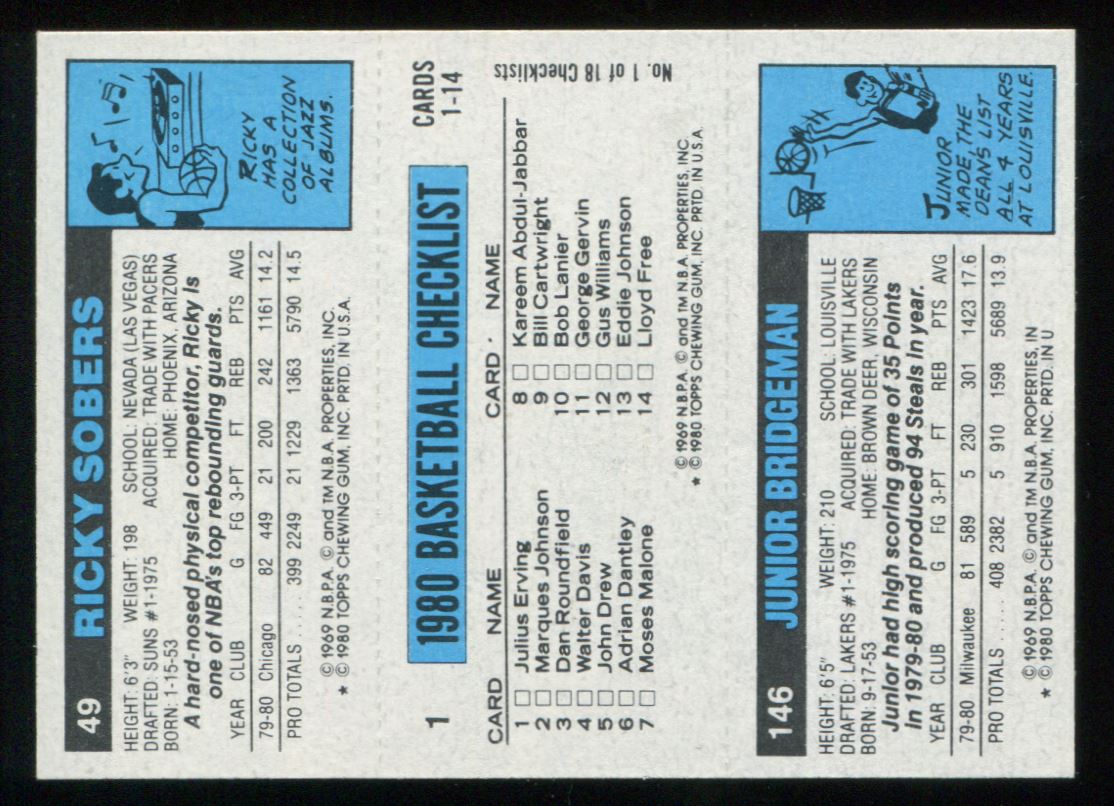 | Description: | Junior Bridgeman/Julius Erving/Ricky Sobers | | Category: | Basketball | | Year: | 1980 | | Product: | Topps | | Team: | Chicago Bulls | | Card Number: | 146/1/49 | | Dimensions: | 3½" x 2½" |