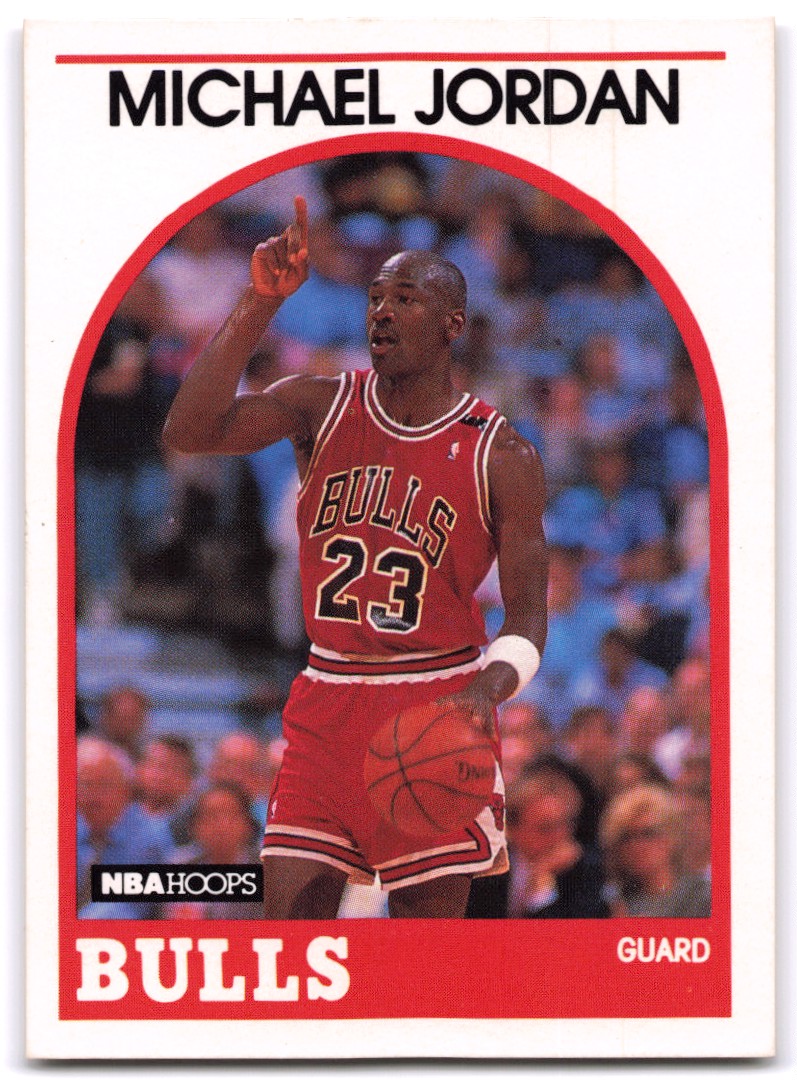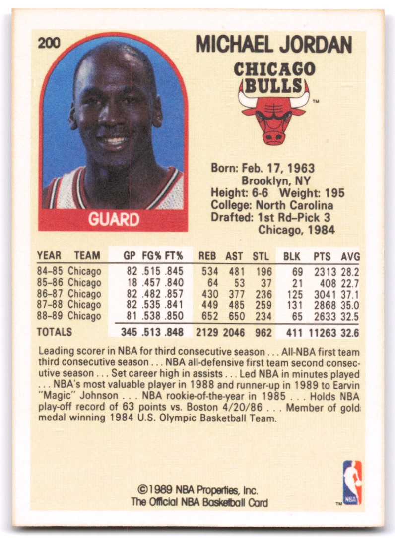 | Description: | Michael Jordan | | Category: | Basketball | | Year: | 1989 | | Product: | Hoops | | Team: | Chicago Bulls | | Card Number: | 200 | | Dimensions: | 3½" x 2½" |