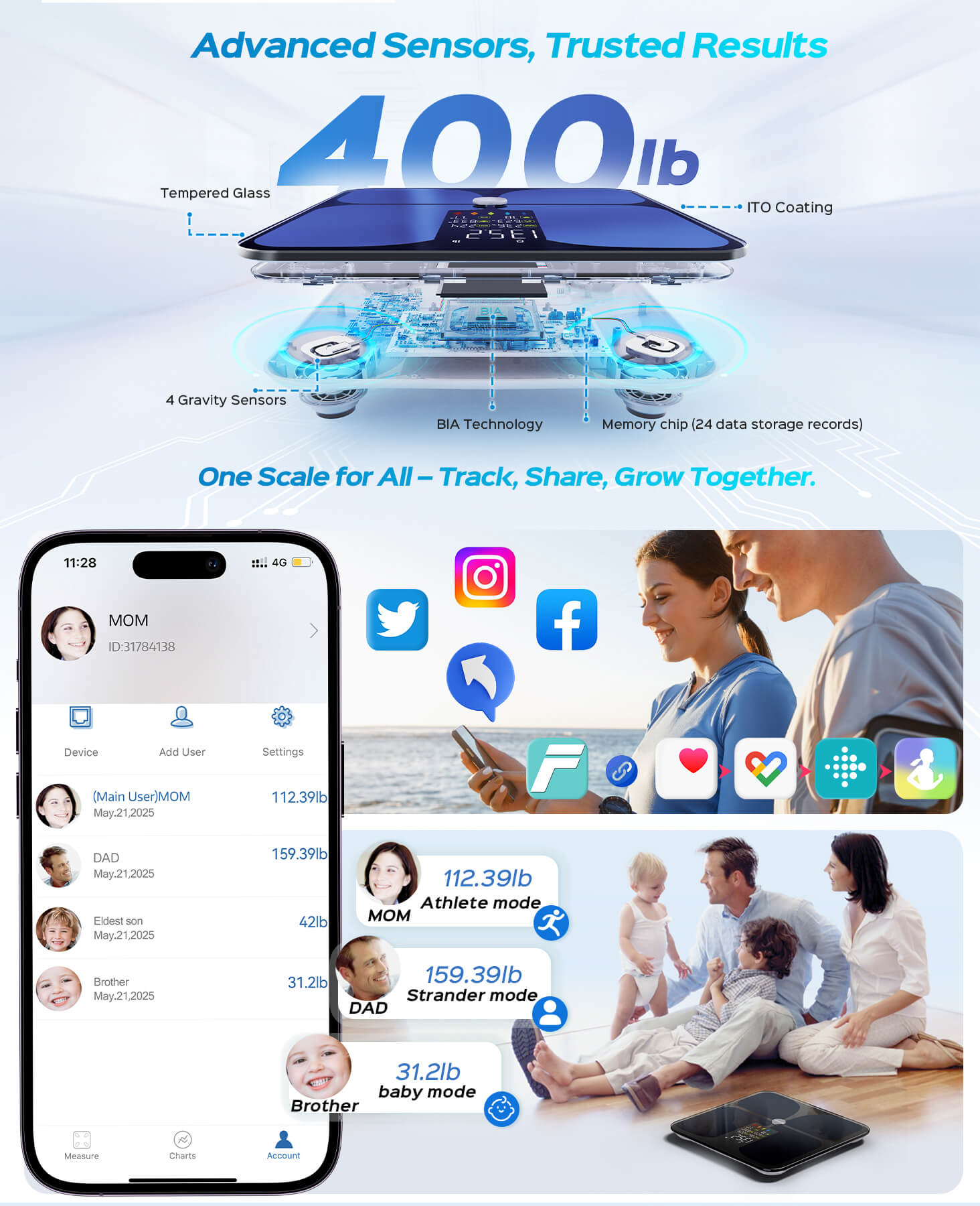 High Accurate Scale Digital Weight: Compare with other body fat percentage scale with 4 metal electrodes, our body scale coated with advanced ITO tech provides much larger sensor area for for all size feet. Equipped with 4 Auto-calibrating G-shaped sensors, the weight scale with body fat and muscle can make the most accurate measurements of your body composition. The measurement result is accurate to 0.1lb/0.05kg. The maximum weight capacity reaches to 400lb capacity.