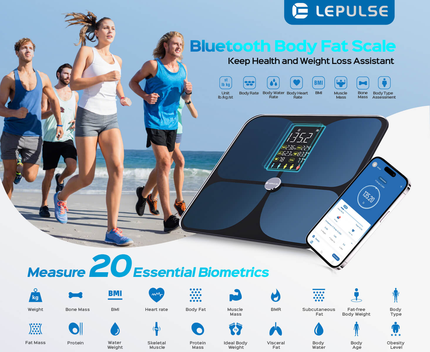 20 Essential Body Composition Scale: This scale for body weight and fat percentage utilizes Bio-electrical Impedance Analysis to calculate 20 body composition measurements, including Weight, BMI, Body Fat, Fat-free Body Weight, Subcutaneous Fat, Heart Rate, Heart Index, Visceral Fat, Body Water, Skeletal Muscle, Muscle Mass, Bone Mass, Protein, BMR, Body Age. This digital weight scale is perfect for you to track weight loss and guide you to maintain a healthy lifestyle.