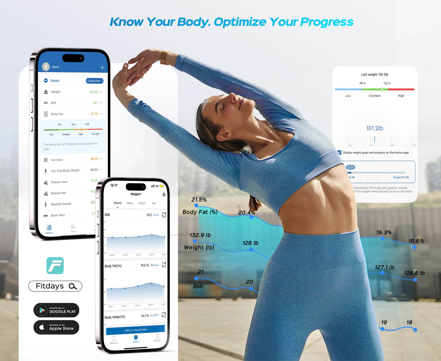 Syncs with Fitdays APP & Fitness APPs: Download "Fitdays APP" at Apple Store or Google Play. The digital scales for body weight syncs the data onto your smartphone automatically via Bluetooth 4.0 BLE. The app provides detailed charts and trends of 20 body composition metrics over days, weeks, months or even years. It can also syncs data to fitness APPs like Fitbits, Google Fit, APPLE Health, Samsung Health, which means, you can use our App to track and manage your health anytime, anywhere!