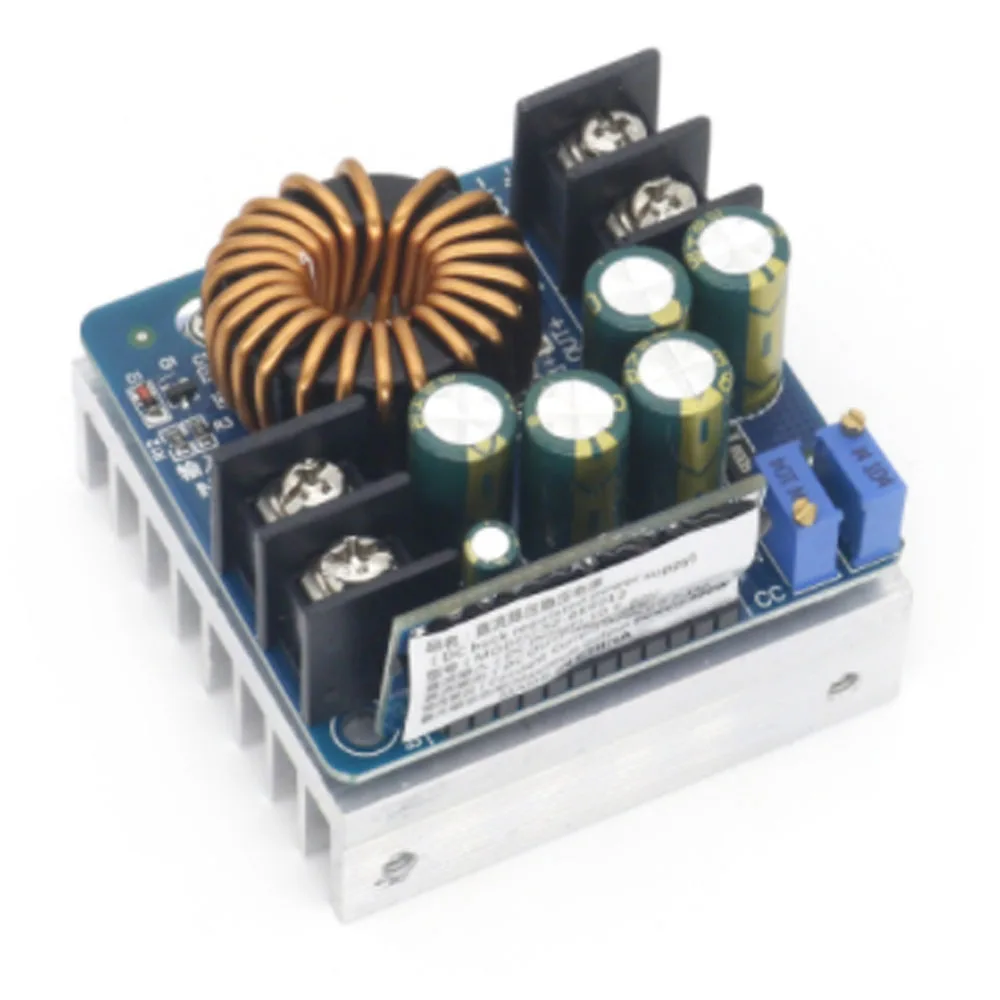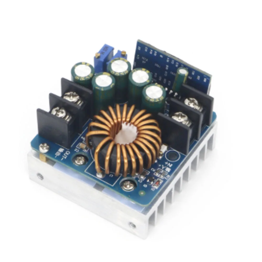 The main features of the power module: 10-60V wide input voltage, suitable for most power supplies on the market as input sources. The output constant voltage constant flow, the voltage is continuously adjustable. Most of the electric equipment can be met. Large output power, good ventilation natural heat dissipation can be 280W / 12A (note that there is output power and output current limit). The module adopts the step-through flow scheme, the efficiency is extremely high, the output voltage is 10V above 92% -96%, There is a constant current indication for the battery. The charging state is at a glance. Enter a 15A fuse, the input positive and negative electrode is not damaged by the power supply (will burn the fuse, need to replace the fuse) Module parameter Module Name: 400W antihypertensive constant voltage constant current Module Properties: Non-Isolation Buck Module (BUCK) Input Voltage: 10.5-60V Output voltage range: 0-45V (must meet the step-down conditions, IN input is 0.8) Output lowest voltage: 0V (+ 1V) Output highest voltage: about input * 0.8 (such as input is 40V, 40V * 0.8 = 32V max output voltage is 32V, the actual will reach 34V.35) Output constant current: 0.2-15A (continuous adjustable, more than 12A to strengthen heat dissipation) Output maximum power: 400W (need to add fan to heat sink and magnetic ring forced heat) Continuous maximum work power: 280W (in a ventilation environment) Continuous maximum operating current: 12A (in a ventilation environment) Enter an undervoltage protection: Yes, (input below 10.5V off output, there is 0.5V left and right error) Input overvoltage protection: no (forbidden overpressure) Work temperature: -10 ~ + 85 degrees (reinforced heat after more than 65 degrees) Working frequency: 100KHz Conversion efficiency: up to 97% (efficiency and input, output voltage, current, pressure difference) Short circuit protection: Yes (constant current protection) Enter the reverse protection: Yes (short-circuited need to be cautiously input the fuse to burn into the fuse,) Output anti-return: no (charge the battery, output the sensing load, such as the motor must be added to anti-irrigation diode) Work indicator: Yes (blue LED light) Constant current indicator: Yes (the CC on the small board "on the constant current work is on the red light, no current output, the constant pressure is not bright) Wiring method: self-contained welding 25A terminal block Module size: length 60 width 60mm high 45mm Net weight: 170 grams. Plug in 180 grams. Packing: Separate carton packaging. Wiring: "Input / IN" is input. "Output / OUT" is output (there is a Chinese sign)
