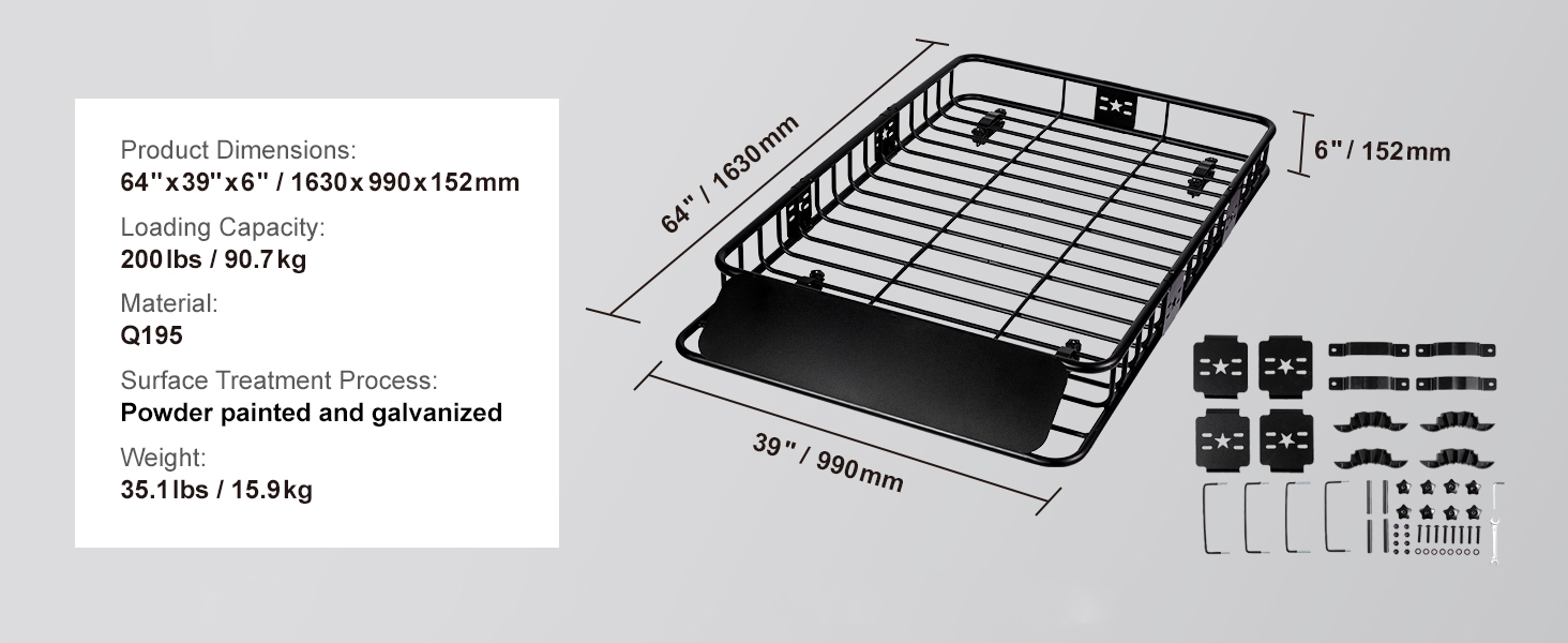 This 64×39×6 inch rooftop cargo basket is designed to carry up to 200 pounds of luggage, gear, and other essentials. Perfect for your next journey, it ensures you have the space and durability needed to tackle any adventure.