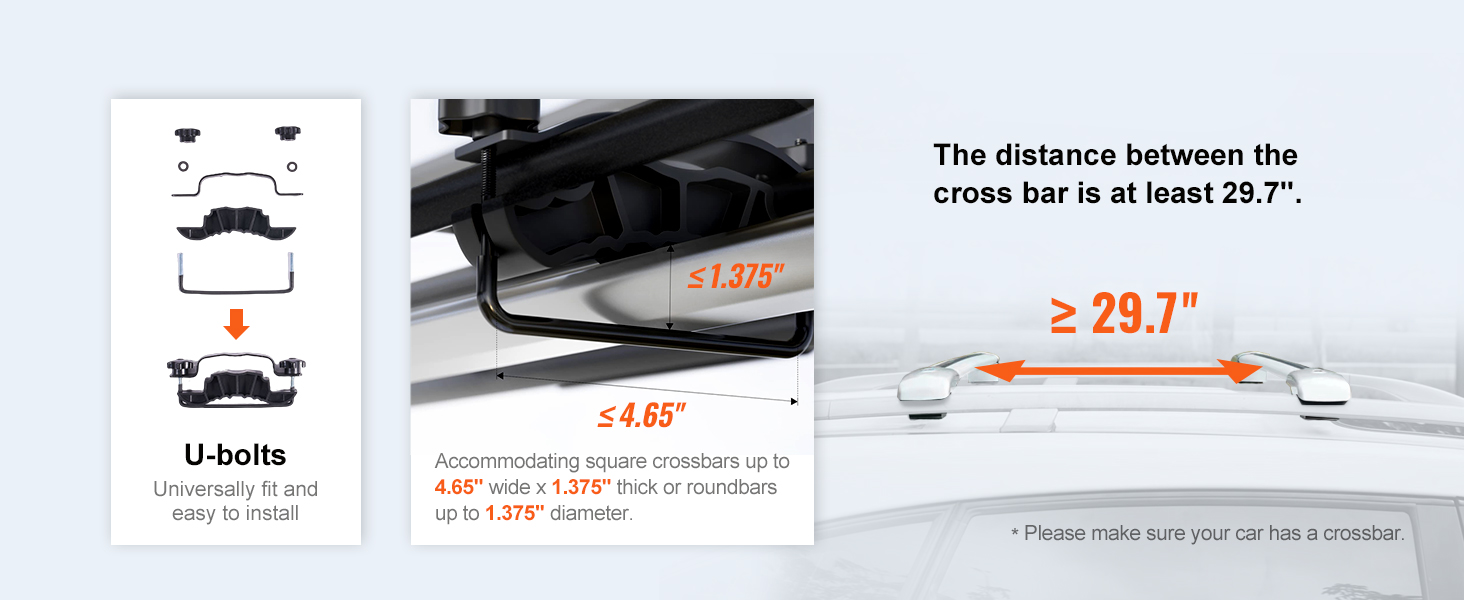 - Versatile U-Bolts: Designed for quick and straightforward installation, the set includes 4 universal U-bolts. These bolts are compatible with square crossbars measuring up to 4.65 inches in width and 1.375 inches in thickness, as well as round bars with a maximum diameter of 1.375 inches. Ensure your vehicle is equipped with a crossbar before installation.
