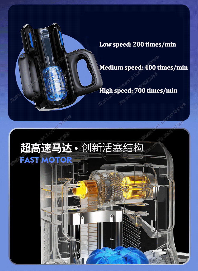 1. Super high speed motor, high speed gear 700 times/min crazy masturbation, medium speed gear 400 times/min fast masturbation, low speed gear 200 times/min slow masturbation;