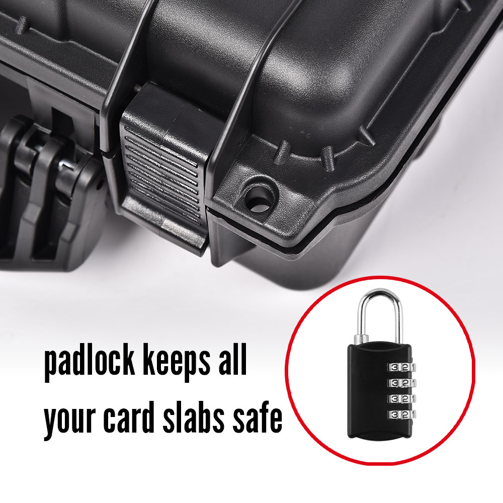 Secure, store, display, and transport your most valued collectibles in style in the roomiest professional, heavy-duty, weatherproof storage box travel case on the market. Easily customizable for your professionally graded sports cards from PSA, BGS, BVG, SGC, one-touch magnetic holders, and top-loaders, each case is constructed of durable, high-density polymer to provide outstanding strength, maximum shock protection, and weather resistance, and features charcoal-colored "pick and pluck" foam to create perfect, snug, and specialized shapes and custom configurations.