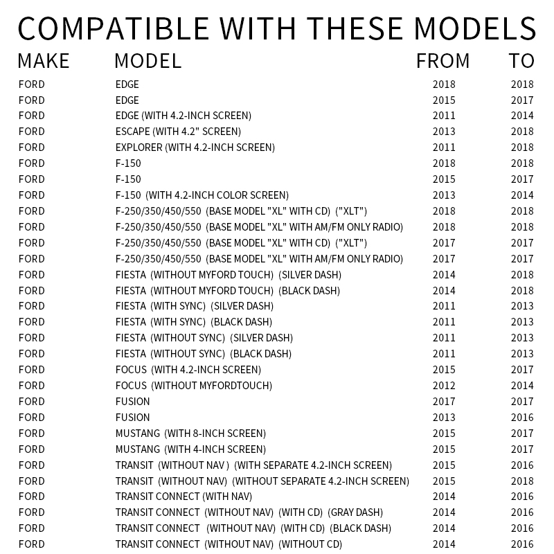 | Ford | Transit (without NAV) (without separate 4.2-inch screen) | 2015 | 2018 |