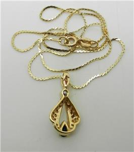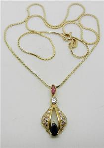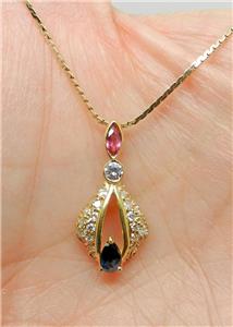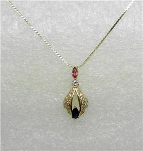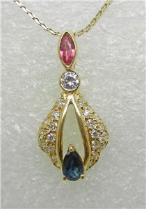 The beautiful pendant and chain are solid yellow gold, the pendant has some markings that are hard to read but has tested 14K, the chain is stamped 14KT. The pendant has a genuine natural marquise shape pink sapphire of approximately 0.20 carat and a genuine natural pear shape blue sapphire of approximately 0.25 carat. There are also 29 genuine natural diamonds that total approximately 0.20 carat, SI1-SI2 in clarity, H-I in color. The pendant measures 7/8" in length and the chain is 17" in total length including clasp.