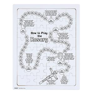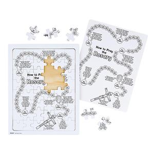 - Puzzle pieces teach meaning of each component in Praying the Rosary as pieces come together