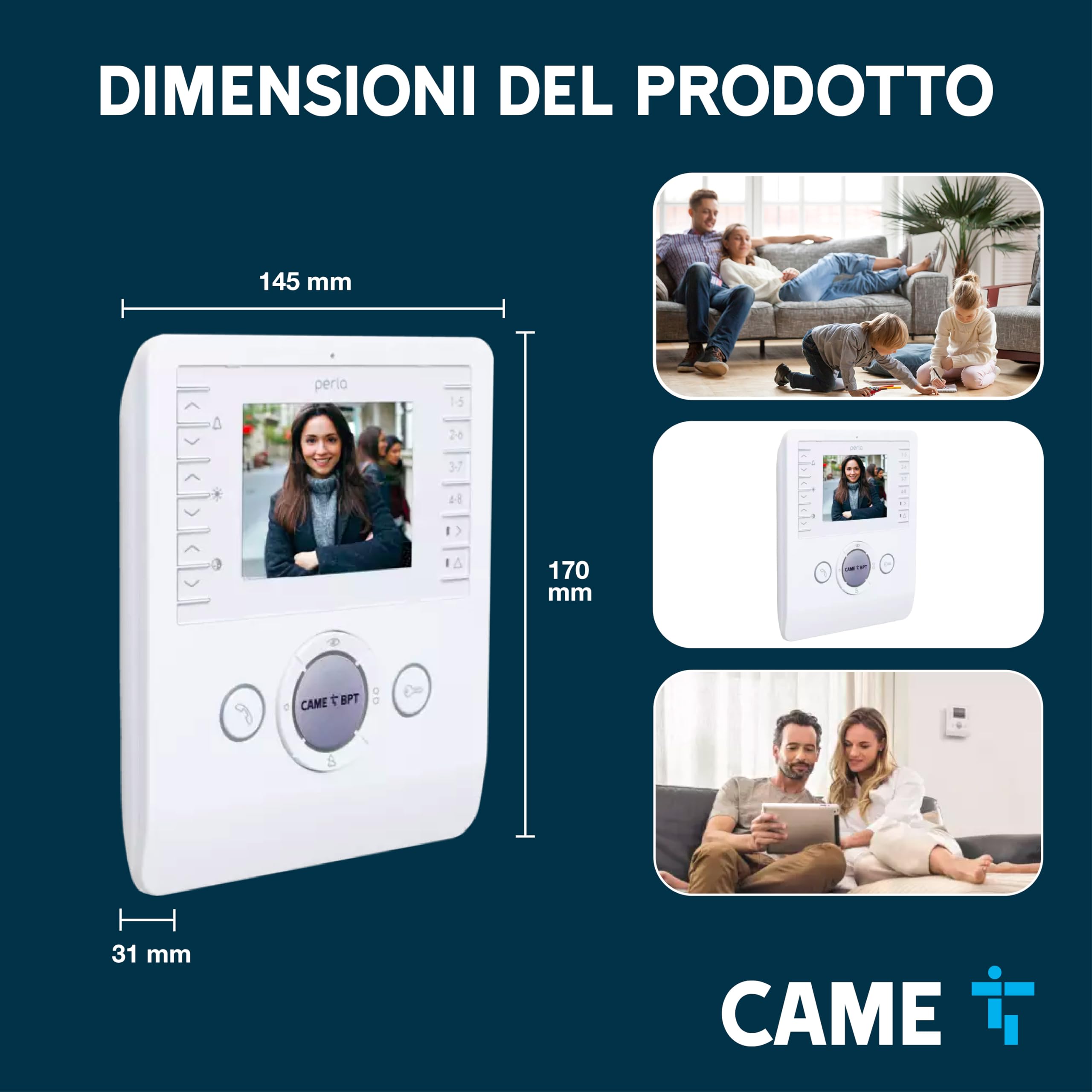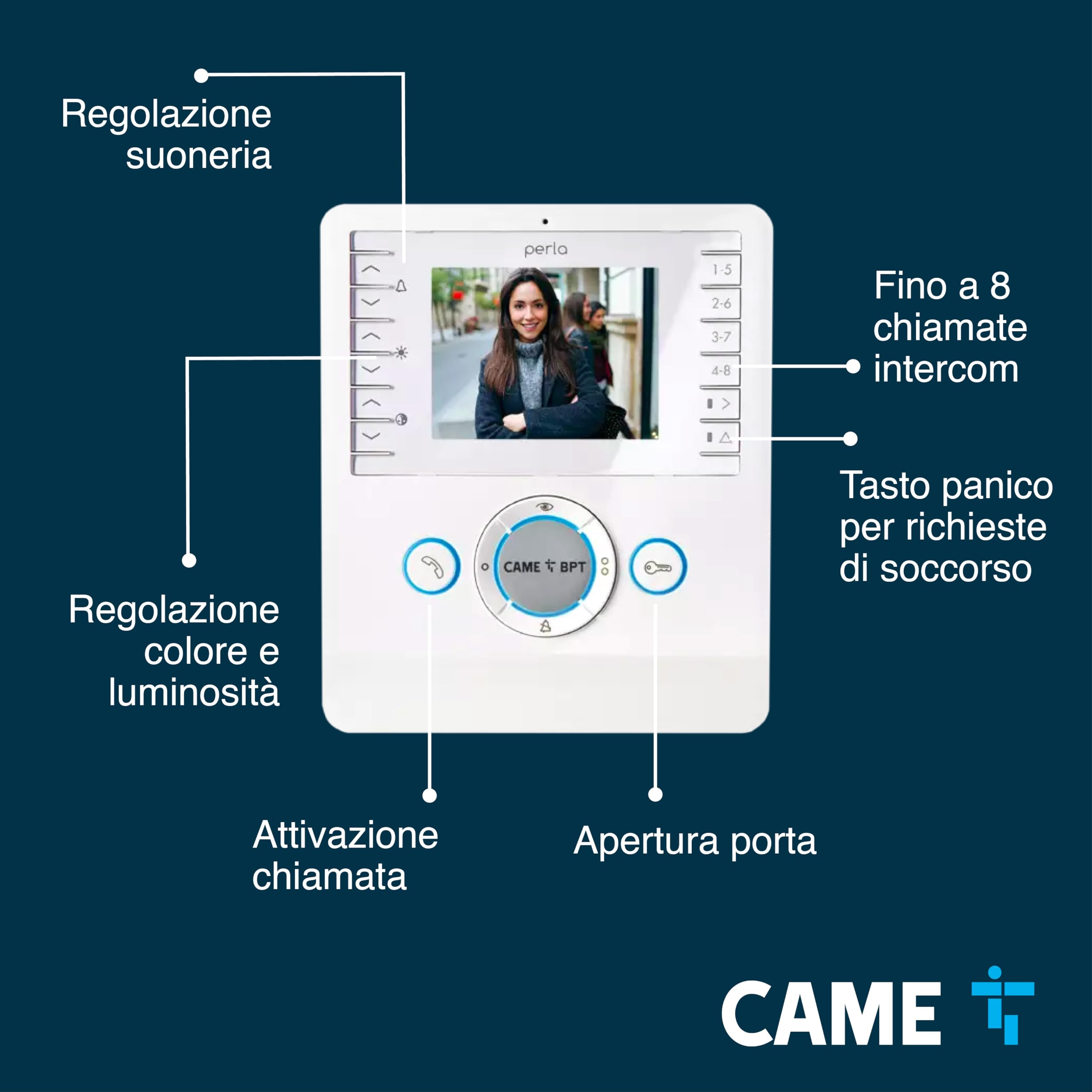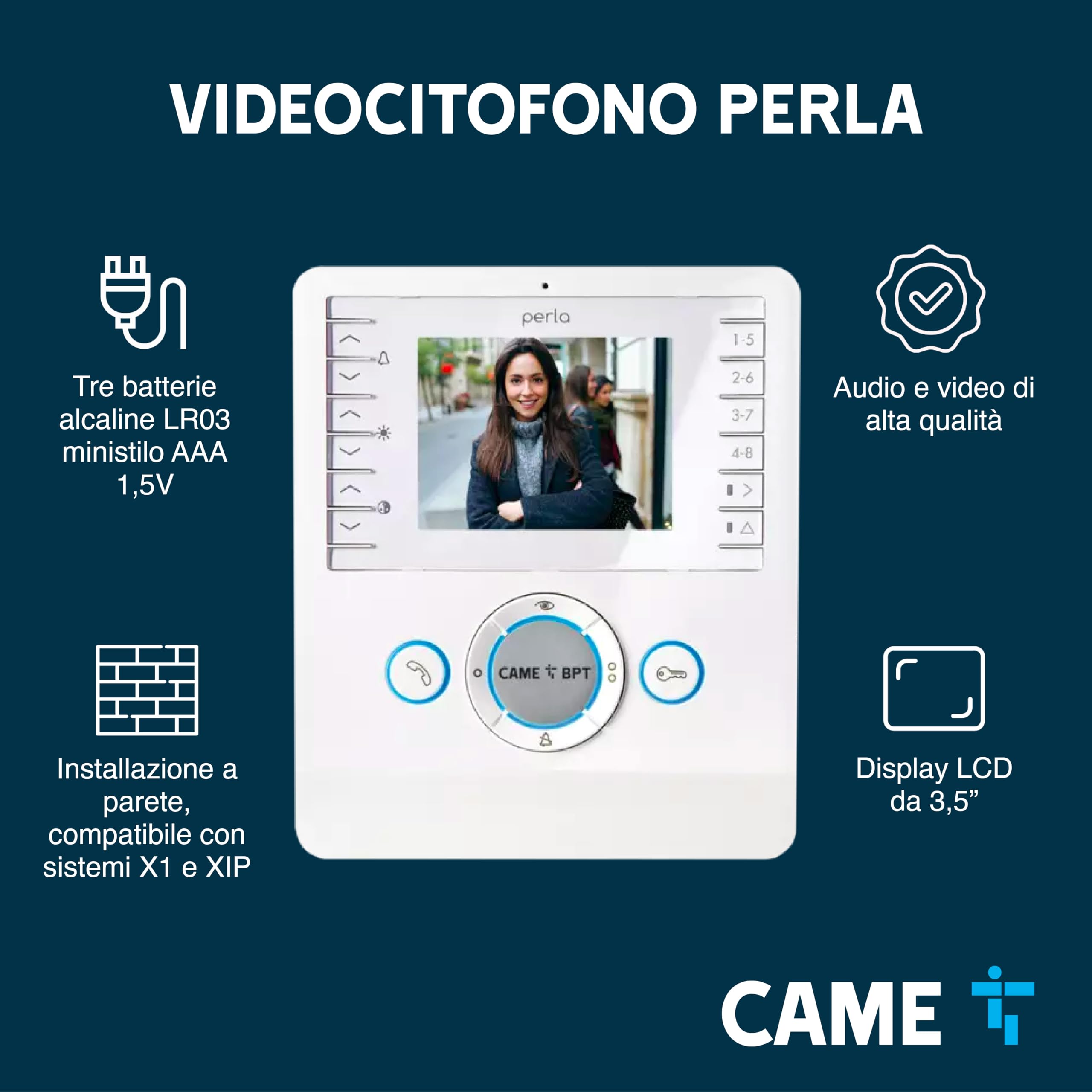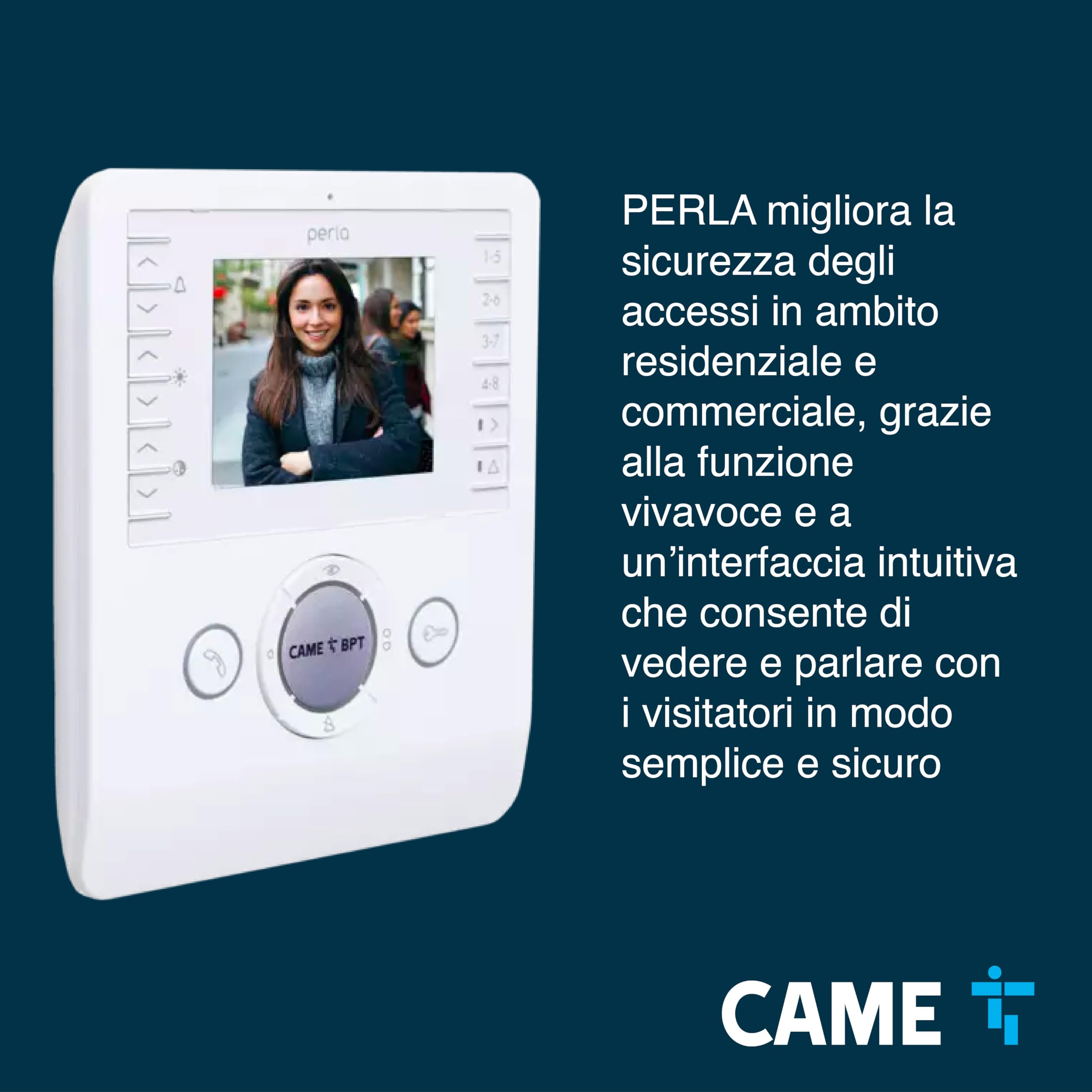CAME Videocitofono vivavoce PERLA bianco con display LCD 3.5", ottima qualità video, due tasti AUX programmabili, compatibile con sistemi X1 e XIP, per una gestione sicura degli accessi residenziali