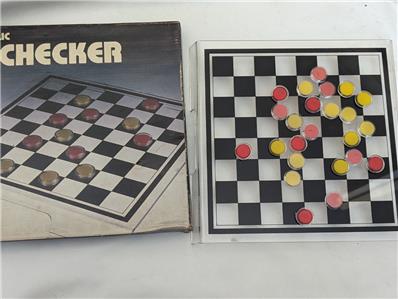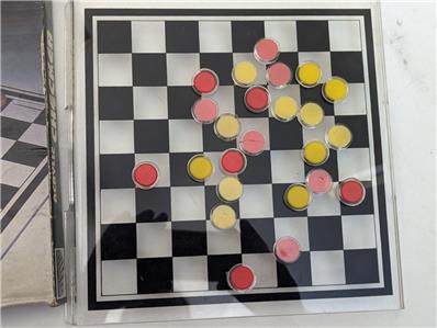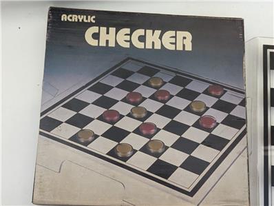 Acrylic Checkers Set 27 x 27cm, board Red and Yellow pieces Complete and in nice condition box has storage wear
