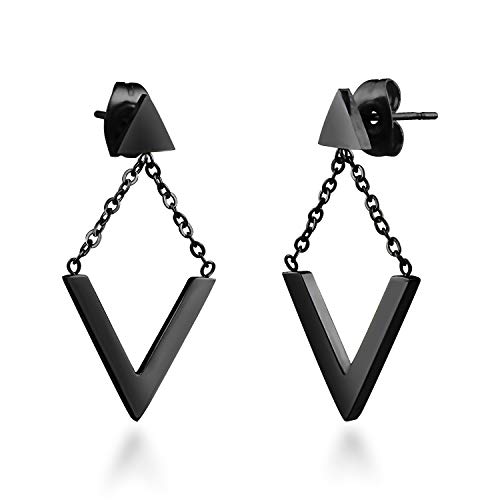 A cute triangle shape stud earring with hanging V shape. This gorgeous dangling earring features a anti slip push back that would secure earring in place without hurting or tugging the ears. This edgy design look can be worn to work school meeting or symbolize as the first letter of your name. This is a must have fashion jewelry that you cannot miss.