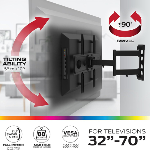 Tilt -5° to +15°, Swivel +/- 90°, and pan the mount left or right to find the optimal viewing position for your space