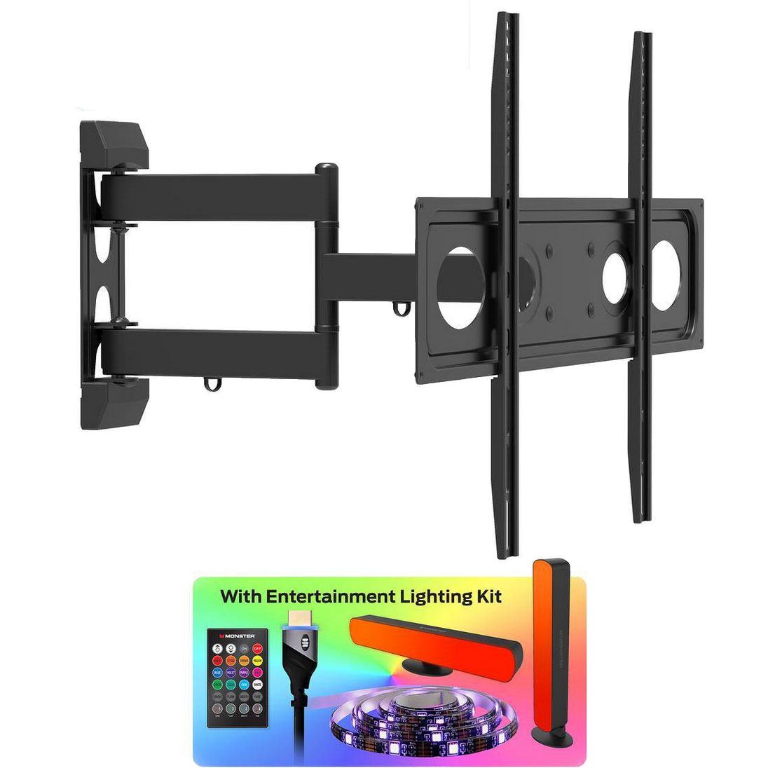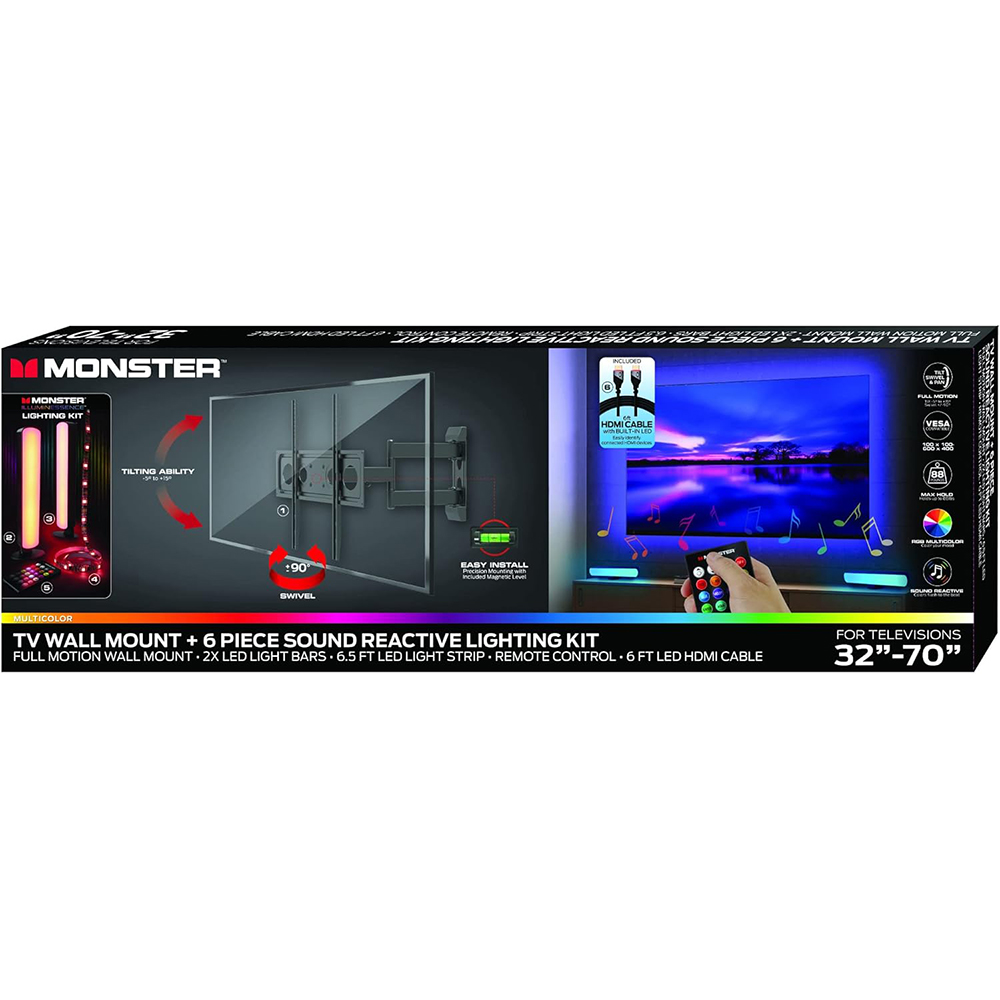 Find the perfect TV angle and create the perfect home theater experience all at once with this complete mounting and lighting kit. Get all of the features you look for in a premium TV mount as well as a stunning theater lighting kit that features tons of RGB colors that are also sound reactive and flash to the beat. With comprehensive installation guides to help you with installation and tons of fun features, treat your television to more than just a TV mount - discover the difference found with a Monster mount!
