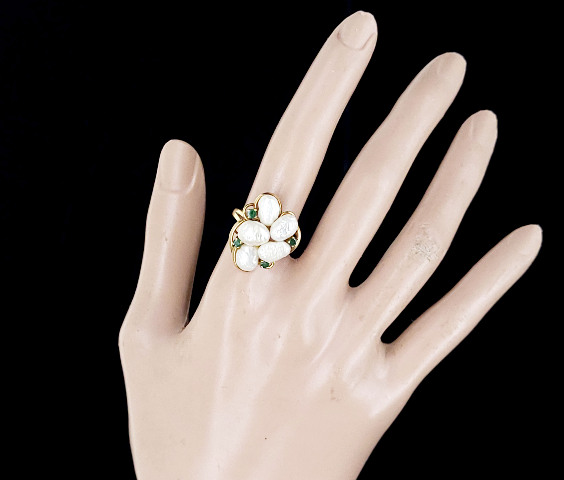 Vintage 14k Yellow Gold Emerald Freshwater Pearl Cluster Mid Century Ring sz 7.5