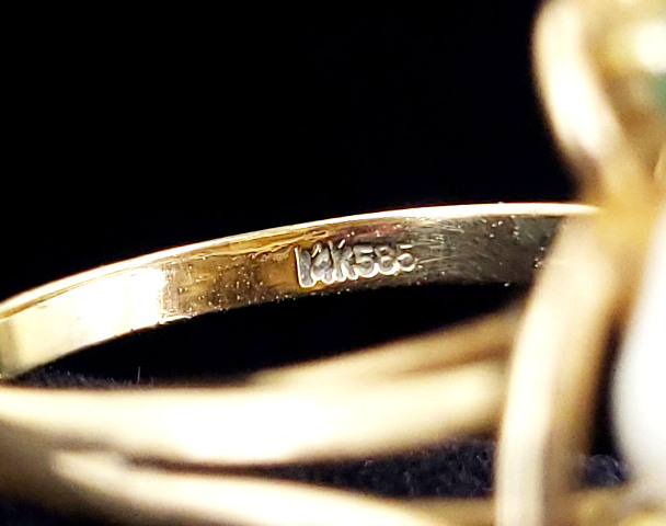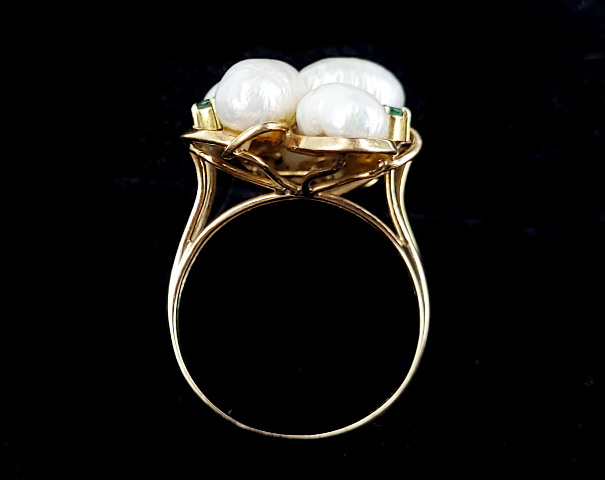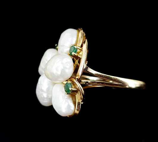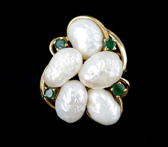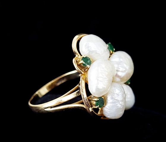 The item up for offer is a vintage mid century 14k yellow gold emerald and pearl ring. This ring features 4 round emerald stones, surrounding a cluster of puffy freshwater pearls. This piece is marked "14k" and "585".