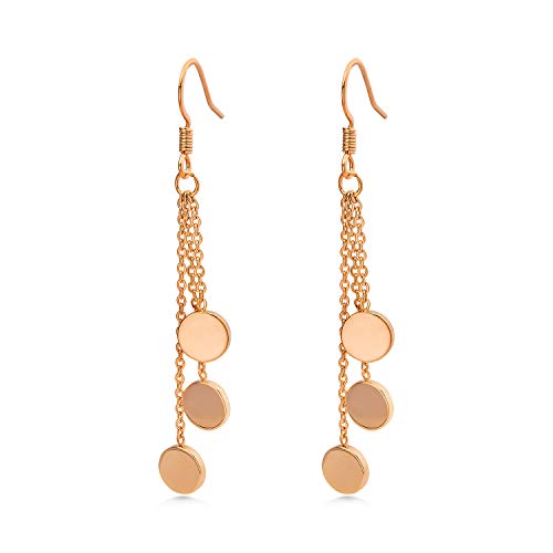 Stylish dangling earring featuring triple shiny circle round shape swinging on a flat cable chain. Secured with fish hook yet still gives a comfortable everyday wear. A perfect jewelry for bold fashion statement or urban city girl. This gorgeous brilliant design is made of high quality sterling silver and hypoallergenic metal for all day long wear.