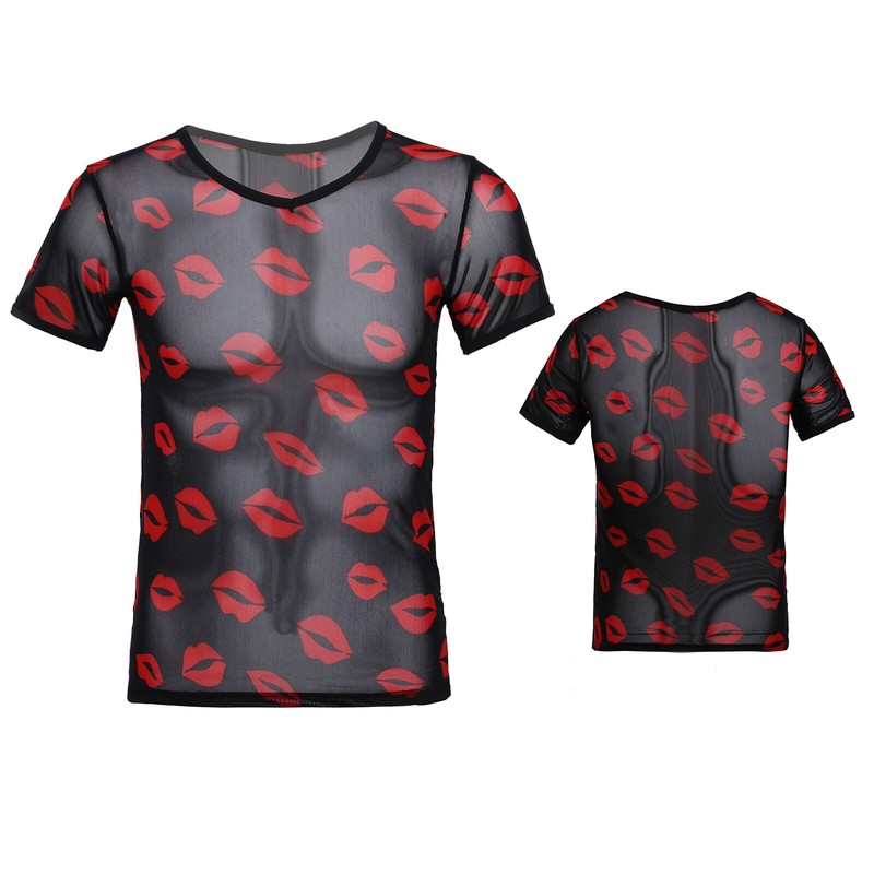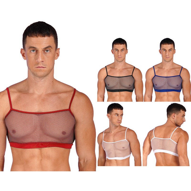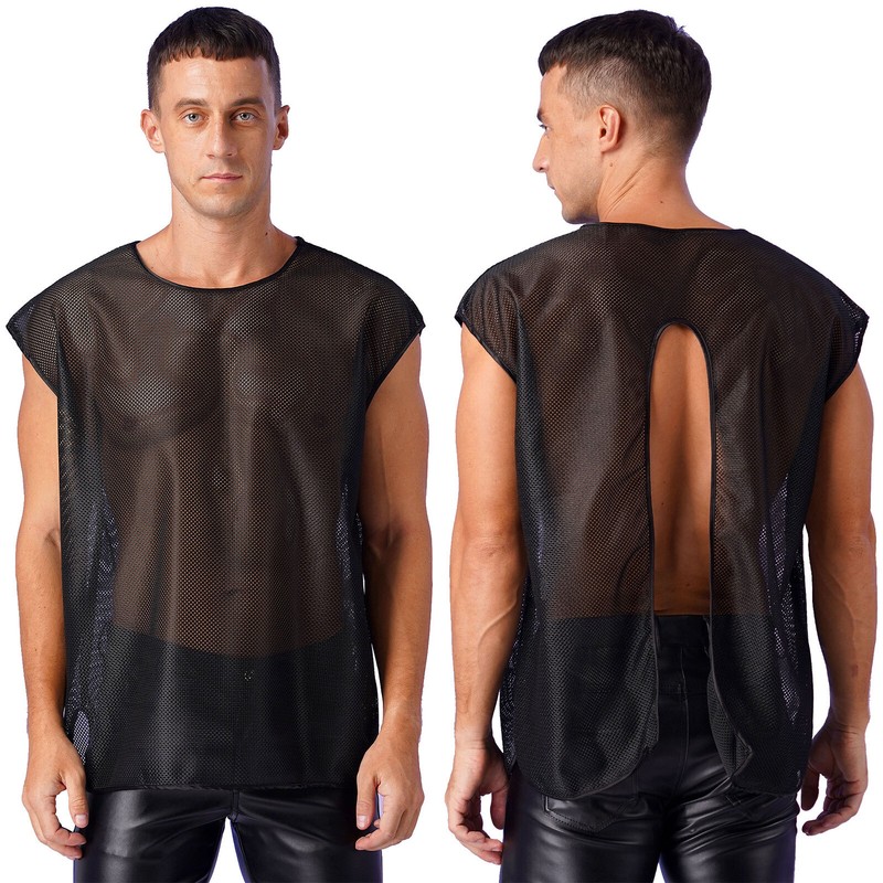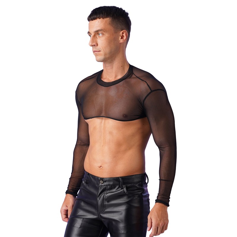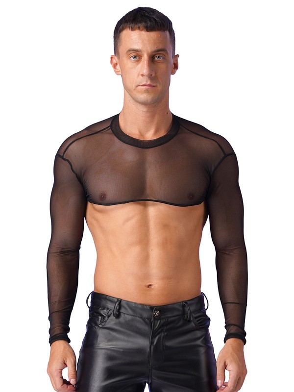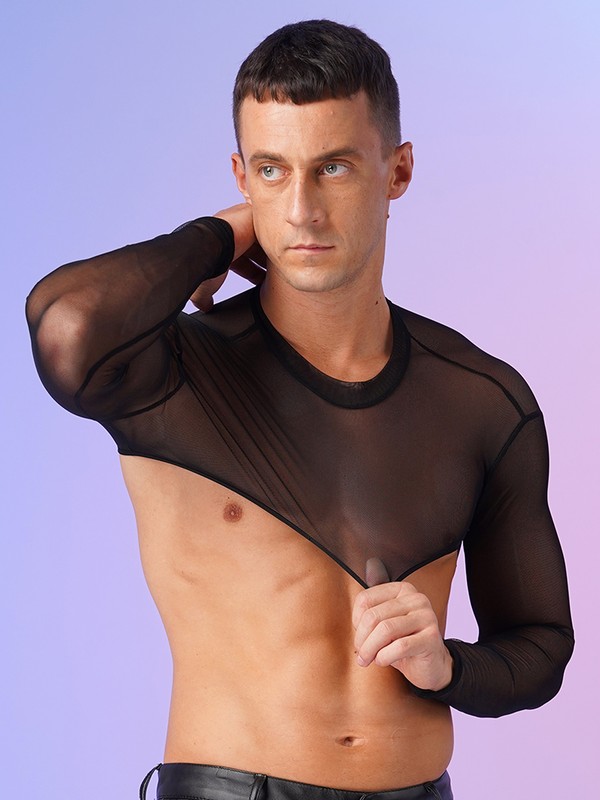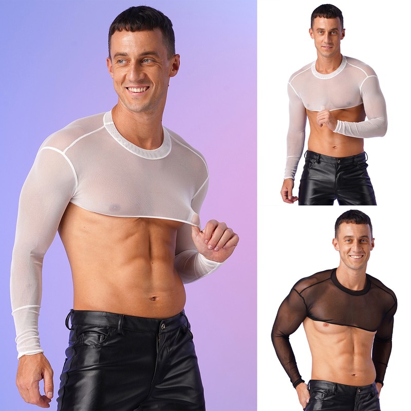 Men's Long Sleeve Crop Tops Sexy See Through Mesh T-Shirt Rave Nightclub Outfits