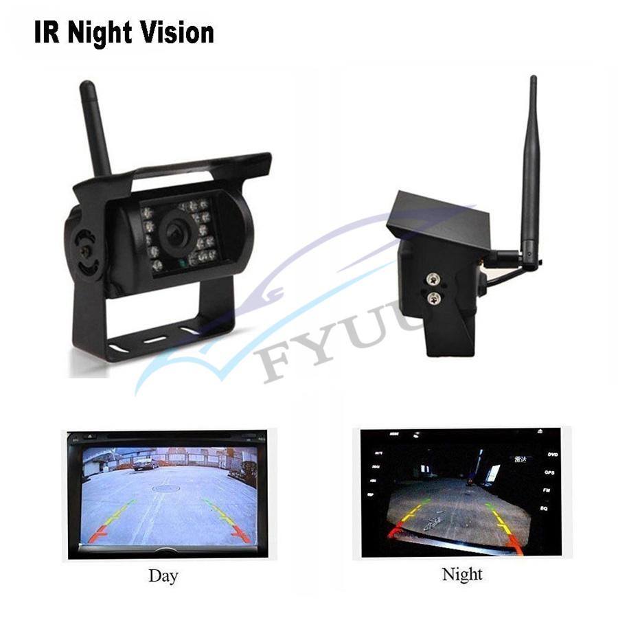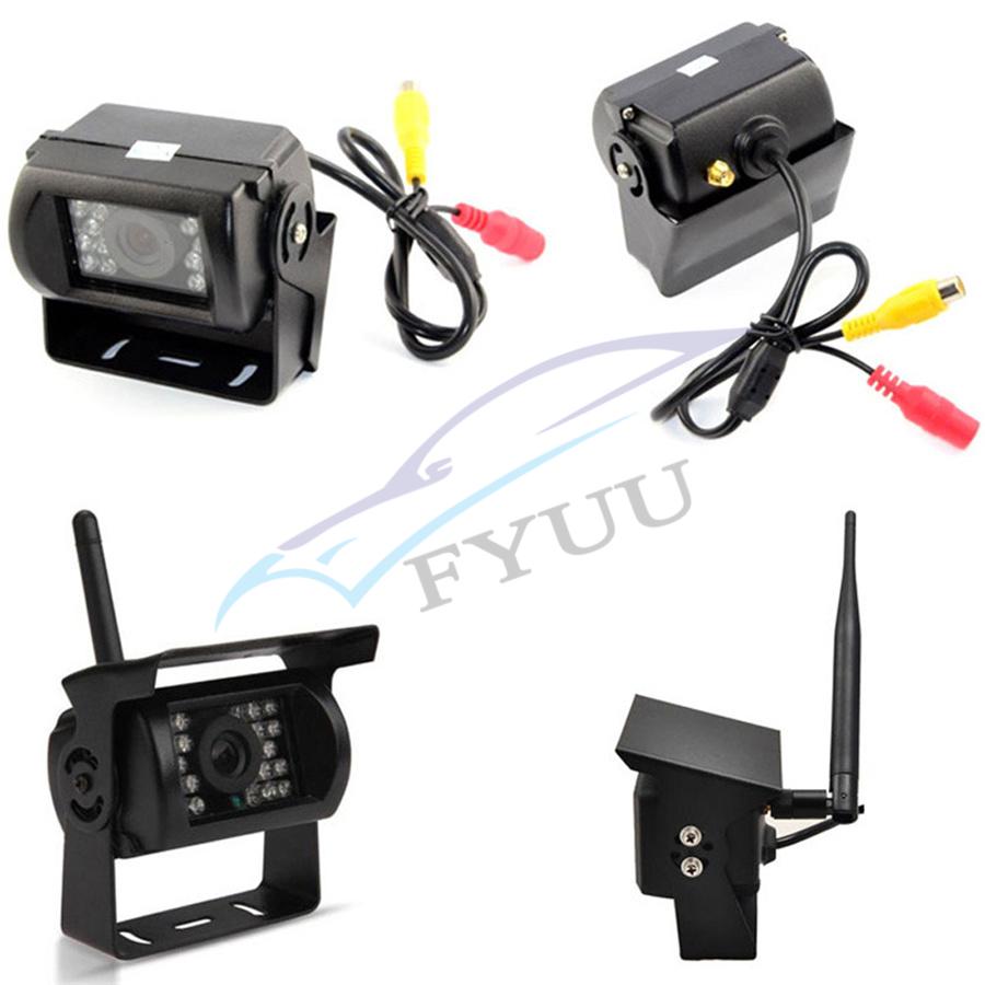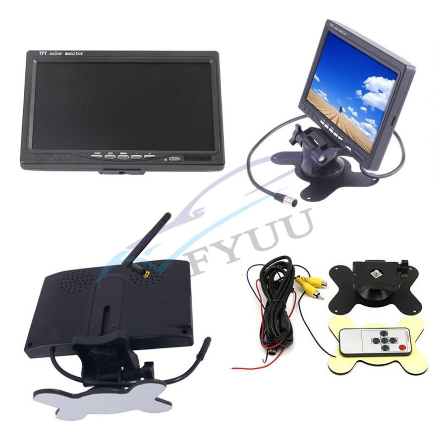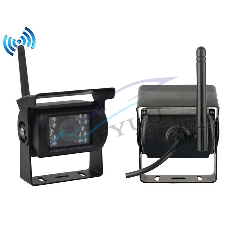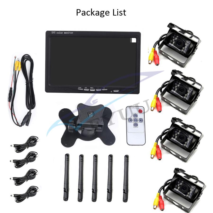 2.4GHz analog wireless 7-inch monitor Transmission distance: 30 meters Compression format: MPEG 4 video Transmit frequency:18 dBm Transmission speed:12 Mbps FHSS: Frequency Hopping Spread Spectrum Hopping rate:1200 / S Screen size: 7-inch 16:9 Resolution: 800RGB x480 dots TV System: PAL / NTSC Operating voltage: 12V / 24V DC Power: ≤8.64W Operating temperature: -10 ℃ to + 65 ℃ Standard NTSC: 510 * 492 pixels, PAL: 510 * 582 pixels Frequency: 2370, 2510, 2390, 2490 Resolution: 420 TVL Lens: 2.5mm Minimum illumination: 0Lux (LED ON) Infrared light: 18pcs Night vision distance:15 meters Waterproof: IP67 View angle:120 ° Operating voltage: 12 / 24V DC Operating temperature: -20 ° C ~ + 70 ° C Shell material: Aluminum Mount material: Metal 4 x Wireless Backup Cameras 5 x Antennas 5 x Power Cable 1 x Remote Controller(No include battery)