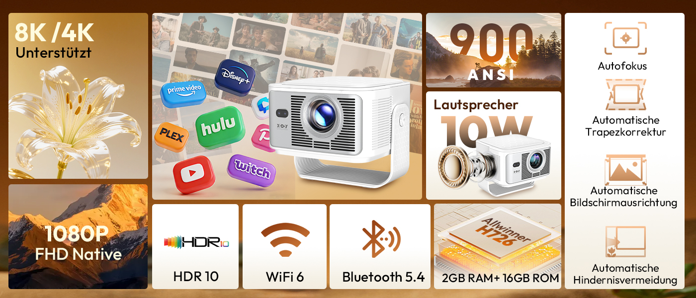 | Spezifikationen: Native Auflösung: 1920 x 1080,Support 8K/4K Helligkeit: 900 Ansi Kontrastverhältnis: 15.000:1 Projektionsgröße: 40–200 Zoll Lampenlebensdauer: 50.000 Stunden Betriebssystem: Android 14.0 Anschlussmöglichkeiten: HDMI, USB, WiFi 6, Bluetooth 5.4 Produktgröße: 222 x 151 x 175 mm (inkl. Halterung)