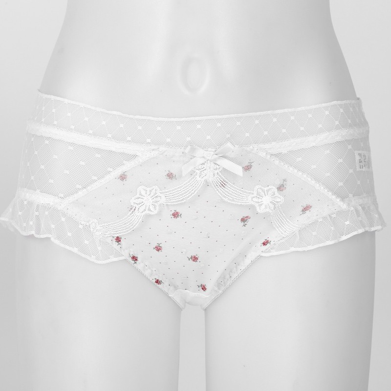 Low waist with a small bowknot for decoration, floral print, lace trim, ruffled details.