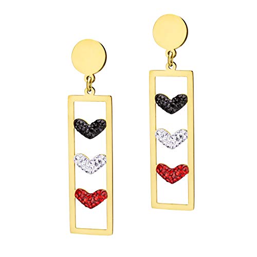 DESIGN - exclusive trio heart shaped earrings for women & girls, these stainless steel heart dangle earrings designed with 3 crystals covered hearts in black, white and red, framed in silver tone polished shiny frame for a modern and elegant look. thin 0.8mm ear pin makes it convenient to take these lovely earrings on and off.