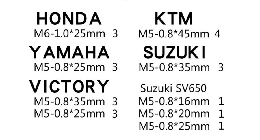 Comes with different specification bolts and washers, fit for varieties of motorcycles, such as for Kawasaki / Honda / Yamaha / Suzuki.