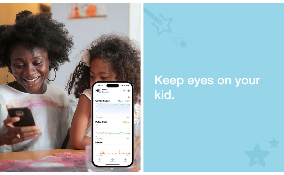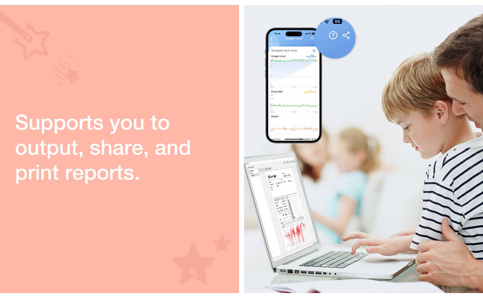 【All-day Monitoring】Put on and start. Continuously Tracking your child's SPO2, PR, PI and body movement and output detailed analysis reports to give you a better understanding of your child's body status.