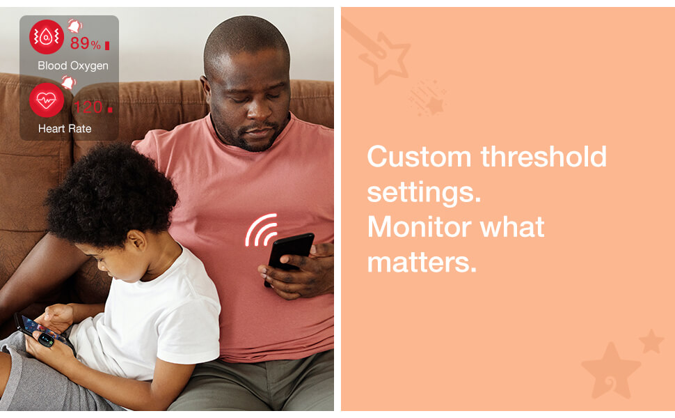 【Buzzer Warning】KidsO2 device and APP beep to remind you when your kids'oxygen level fall below the pre-set value. The threshold and volume can be adjusted freely in the APP.(Note: The APP reminder works only when your phone stayed in dashboard and not locked)